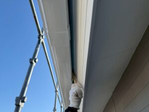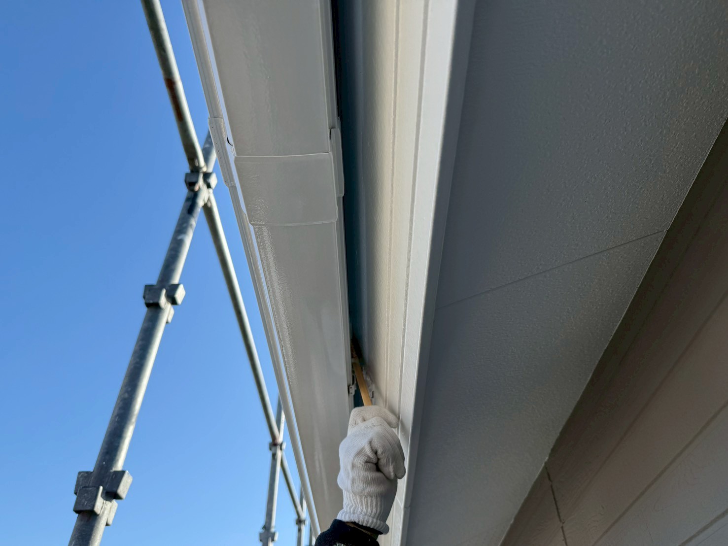 外壁・破風板・雨樋の隙間塗り込み作業です。