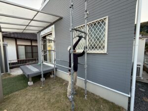外壁・架設足場解体・被害面側、ベランダ横の解体作業です。