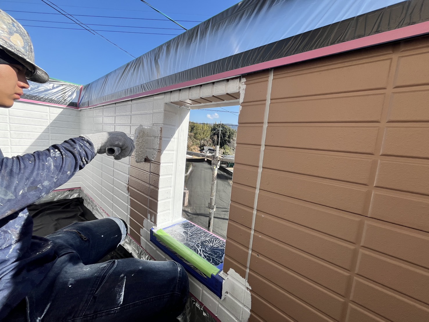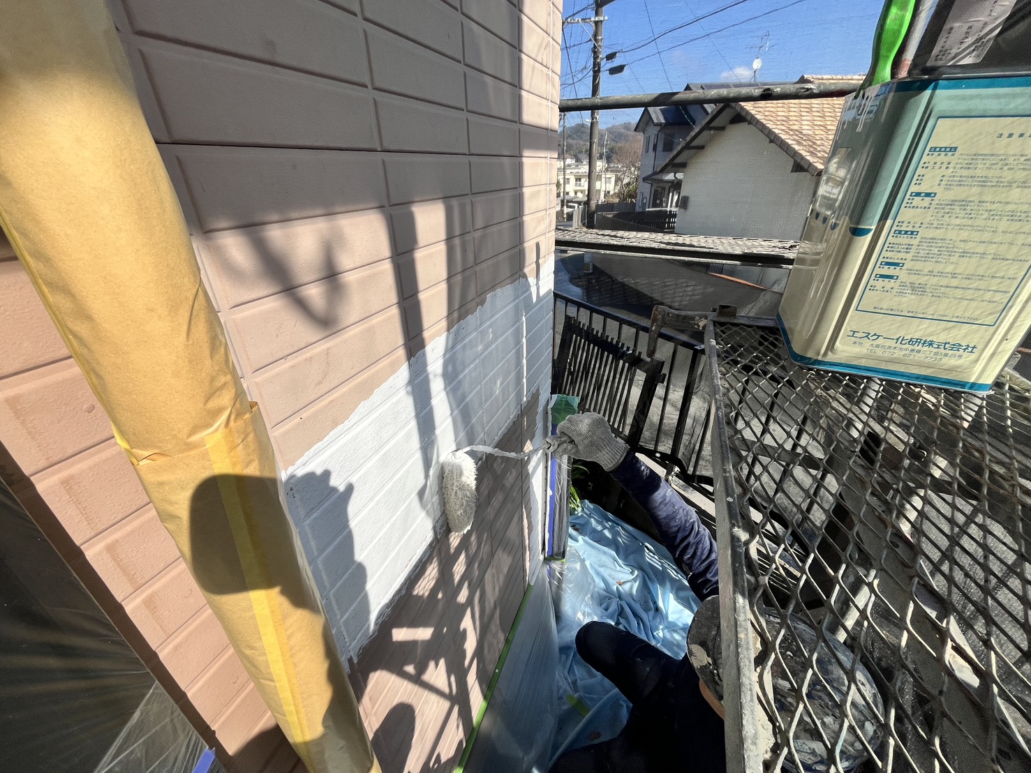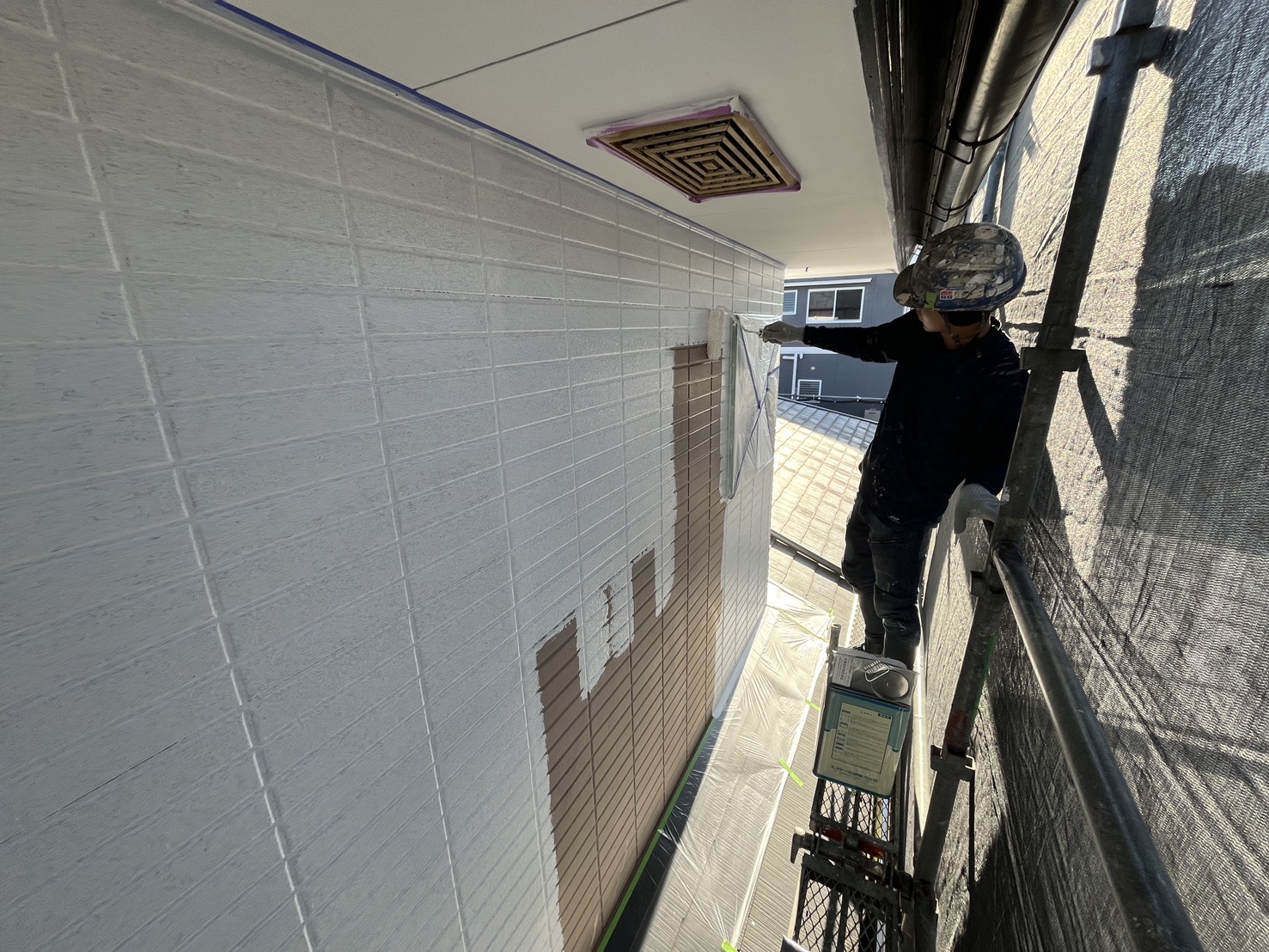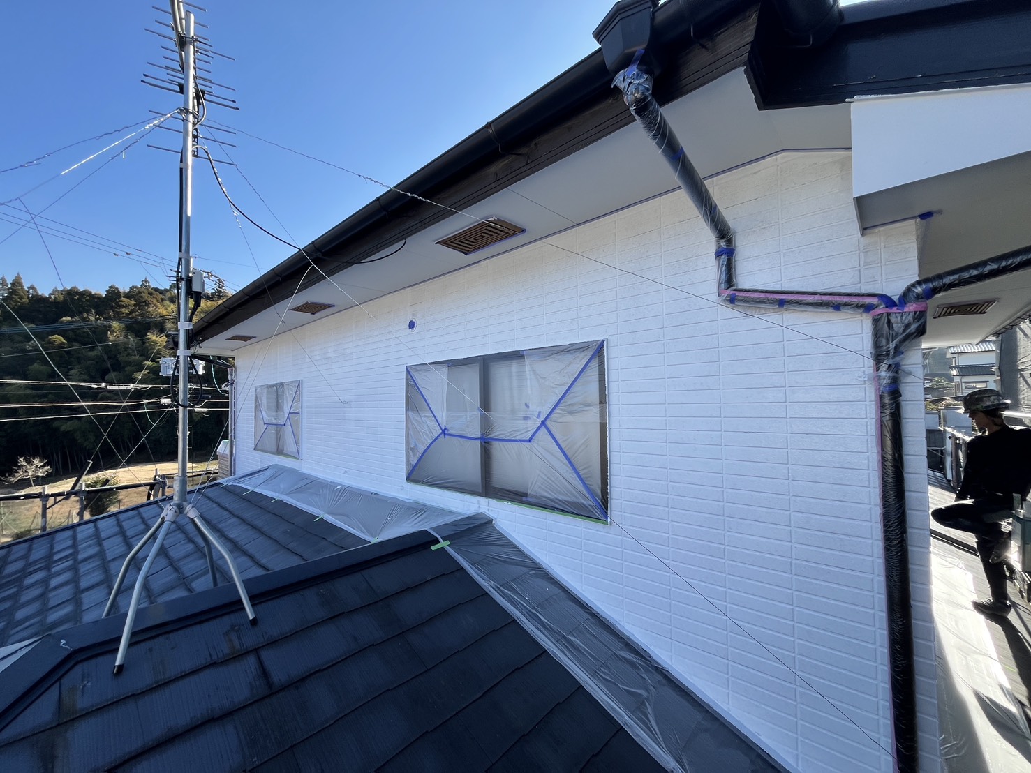 本日の作業は、外壁・養生と下地処理(下塗り)の施工です。