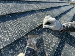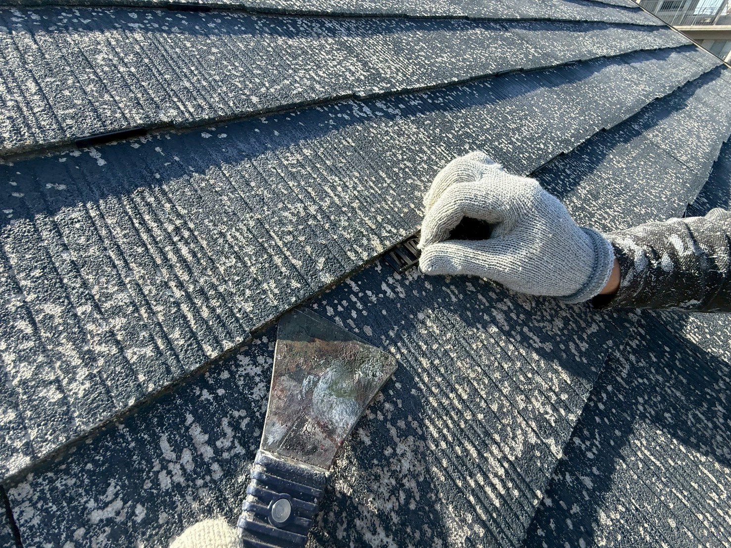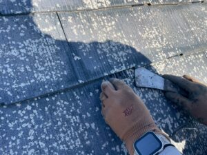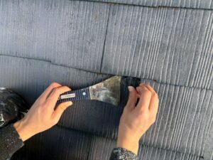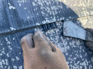 外壁・壁面目地・旧コーキング材撤去作業:少し力を入れて、剥ぎ取ります。