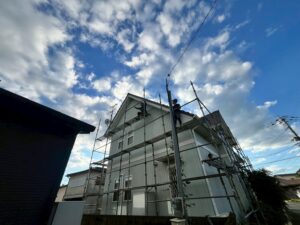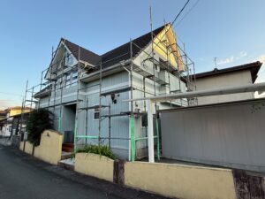 外壁・明日、飛散防止ネット取り付け施工を行います。