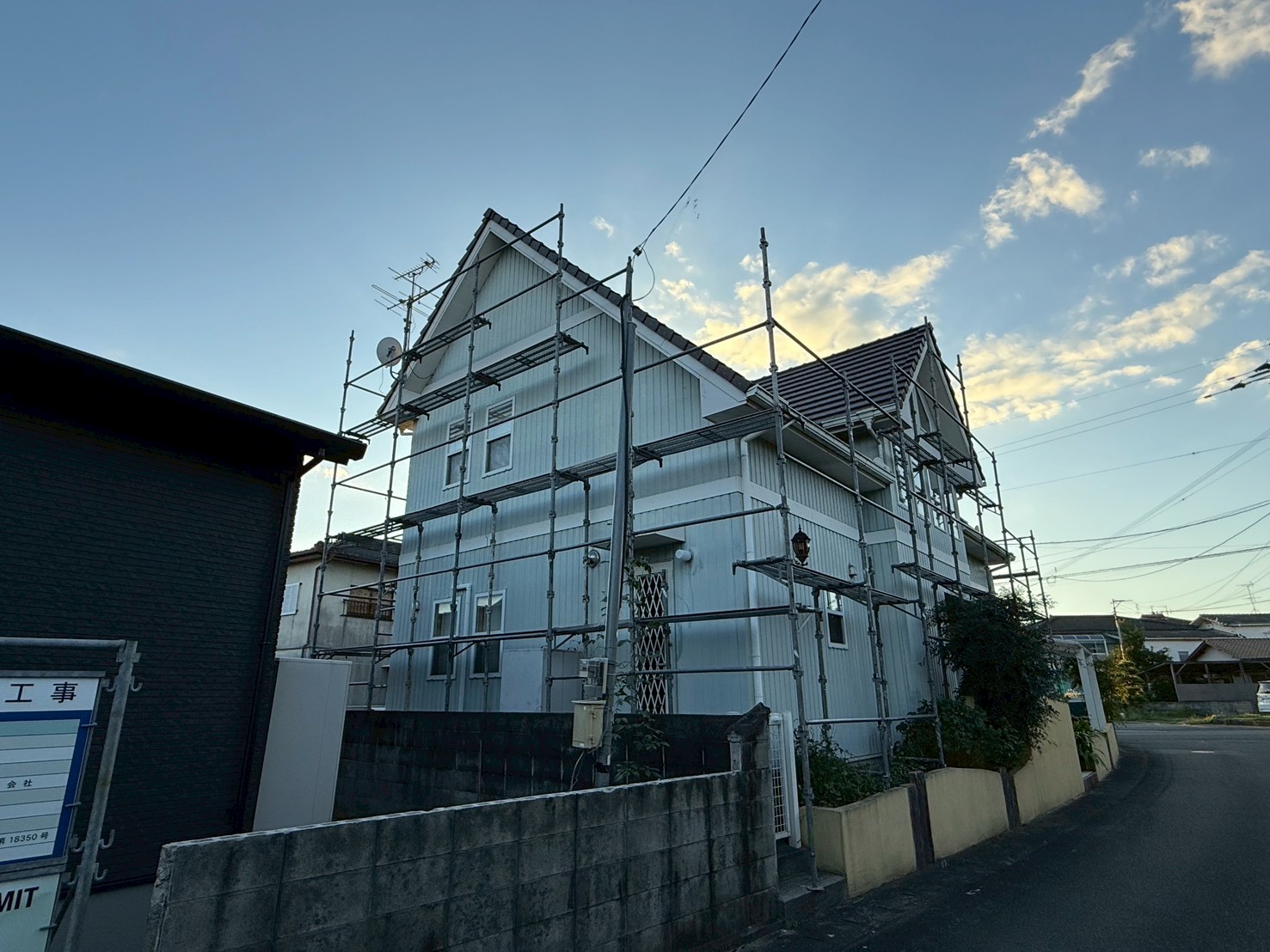 外壁・架設足場組み上げと飛散防止ネット取り付け施工です。