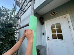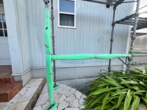 外壁・架設足場組み上げと飛散防止ネット取り付け施工:怪我をされないように保護カバーの取り付けです。