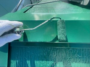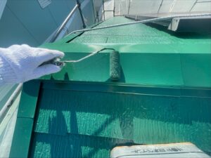 屋根・棟板金部、上塗り仕上げ:ラジカル塗料ローラー塗り施工です。