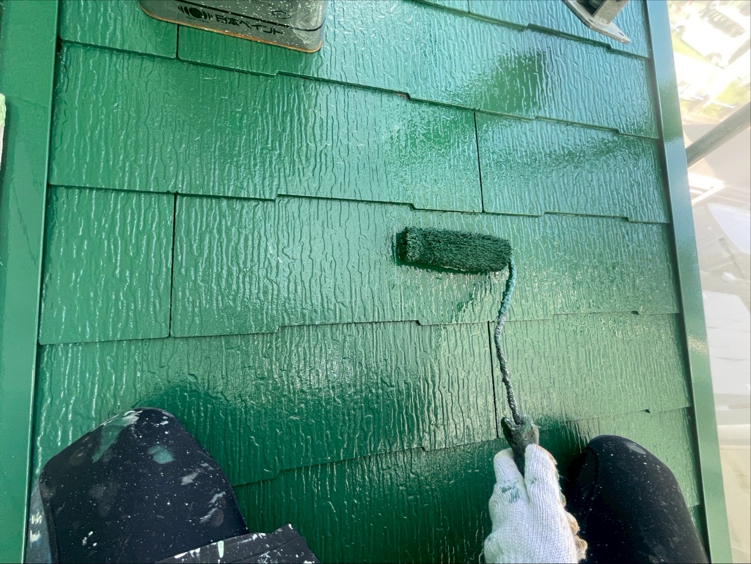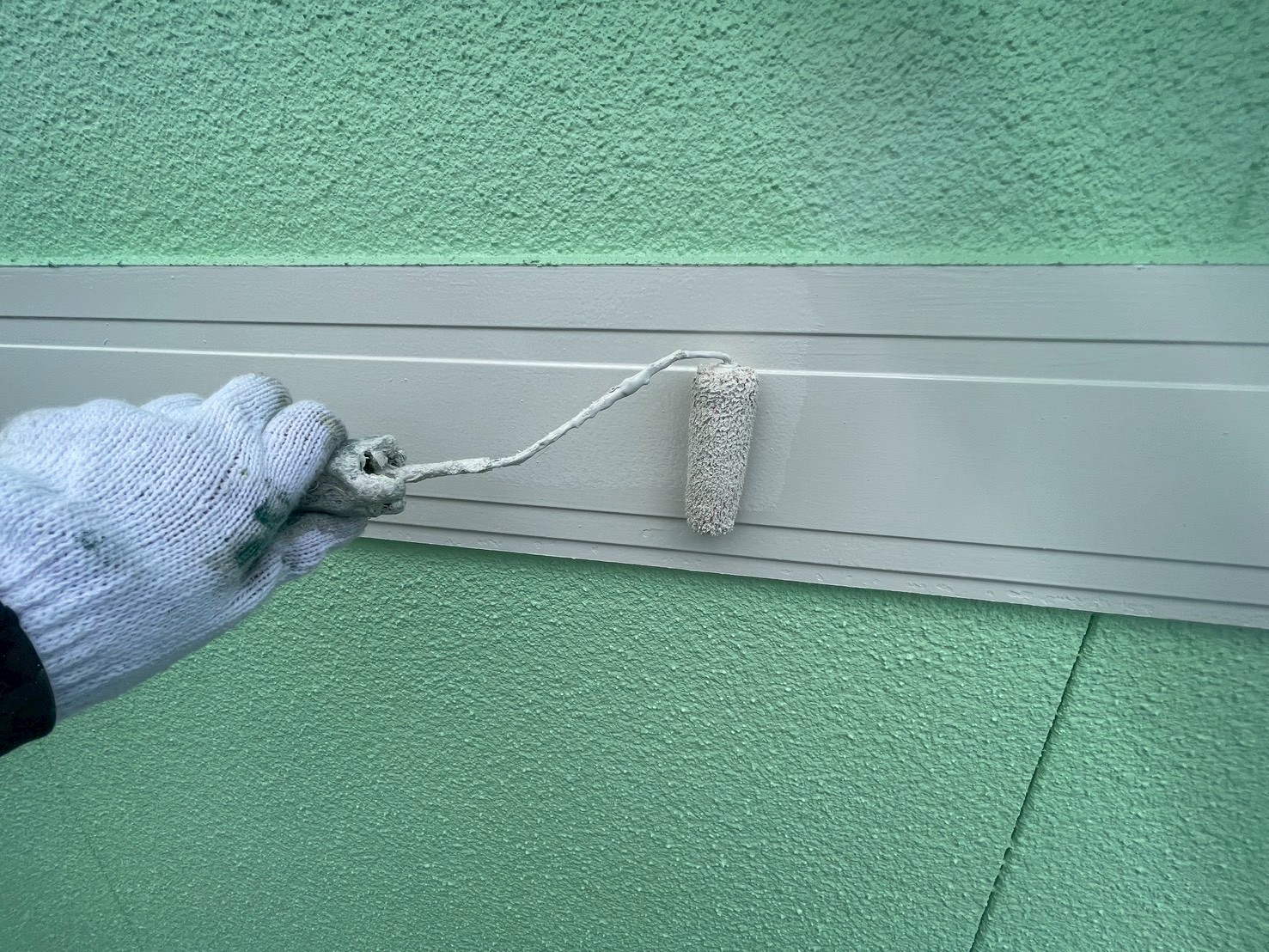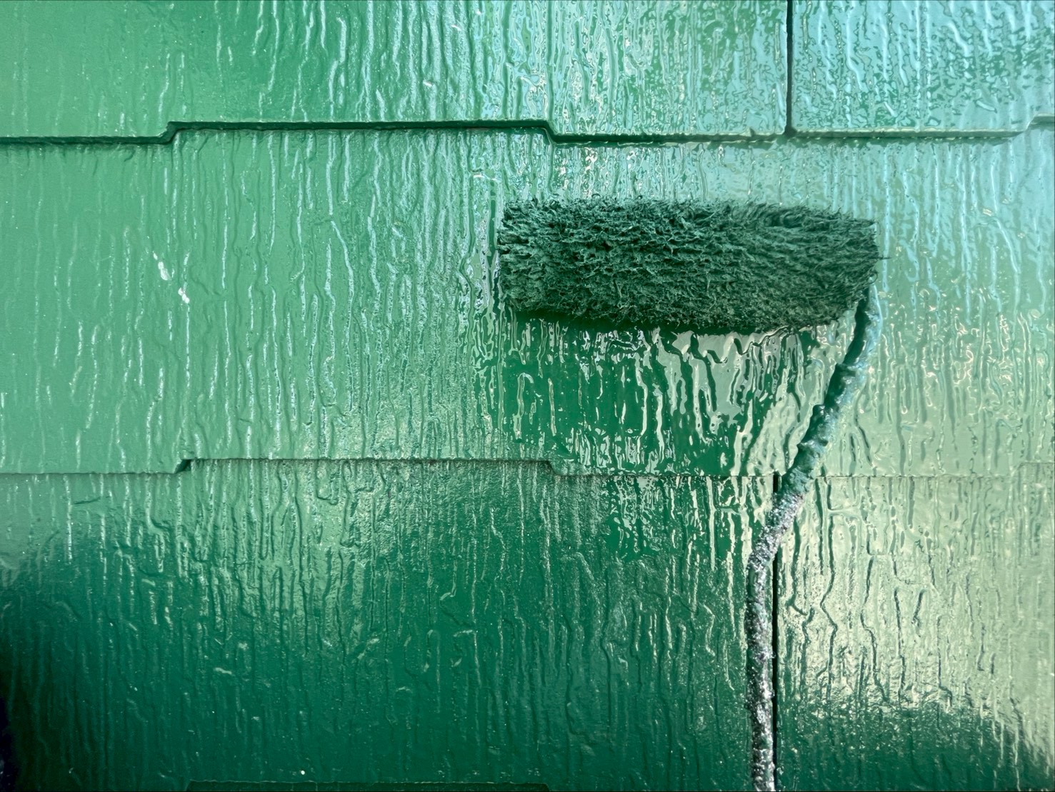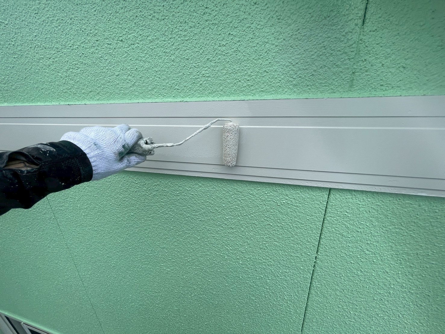 外壁・付帯部・中間帯部、上塗り仕上げ:ラジカル塗料ローラー塗り施工です。