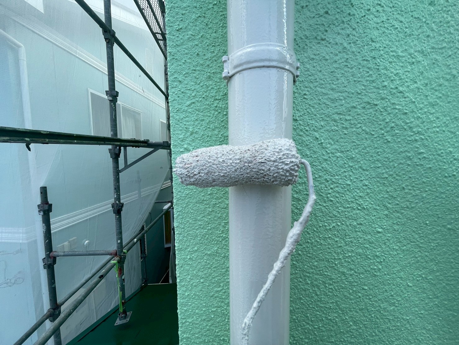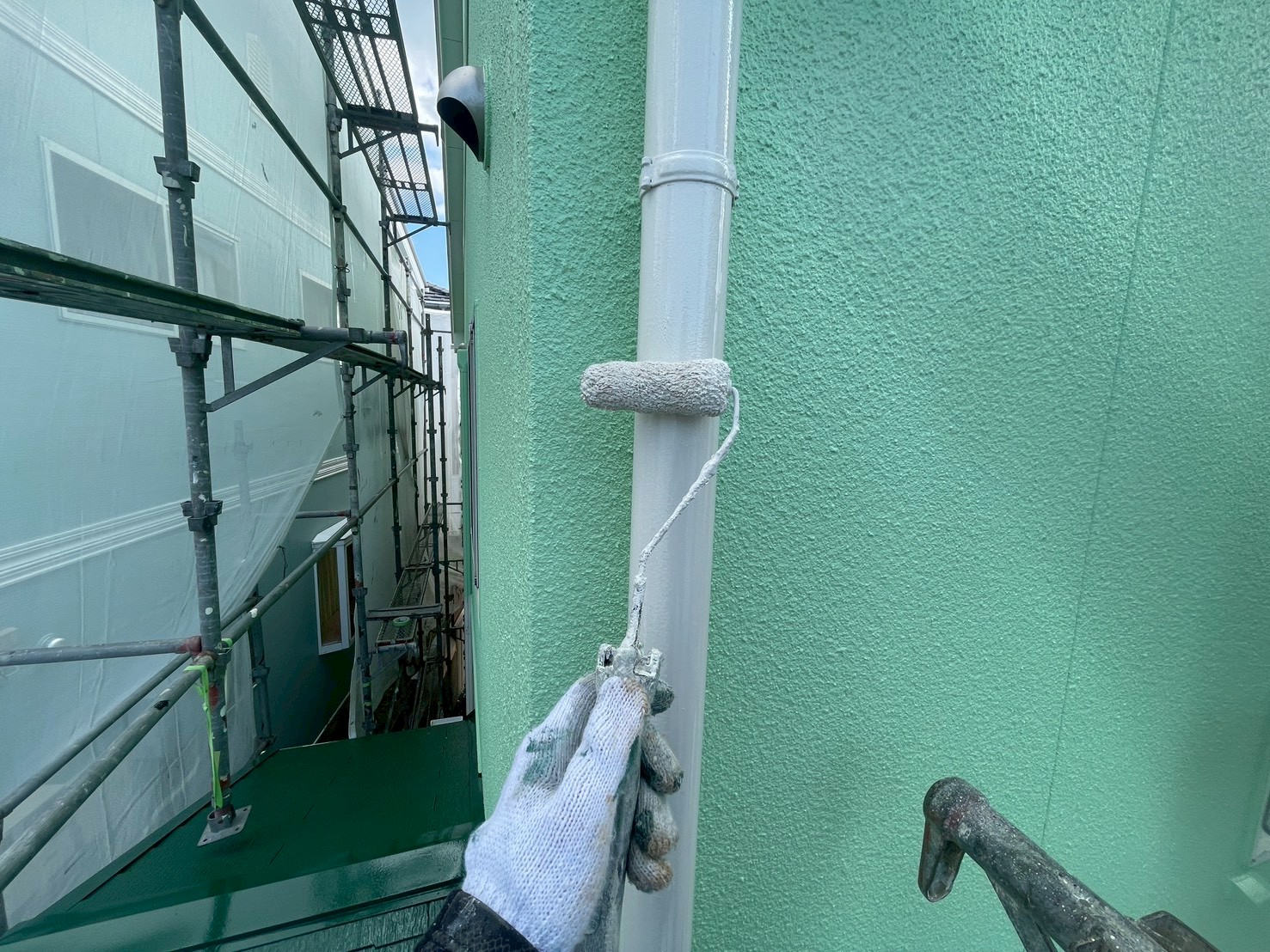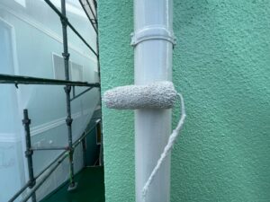外壁・付帯部・縦樋、上塗り仕上げ:ラジカル塗料ローラー塗り施工です。