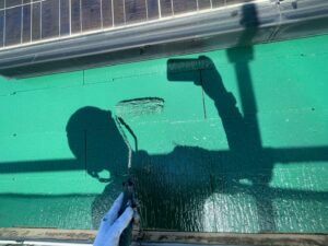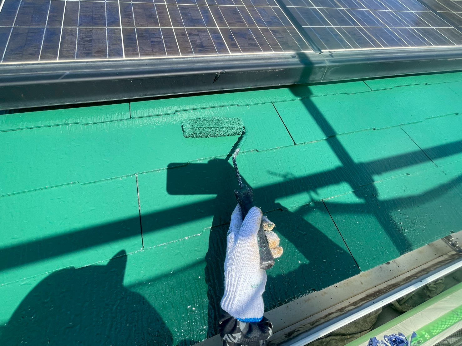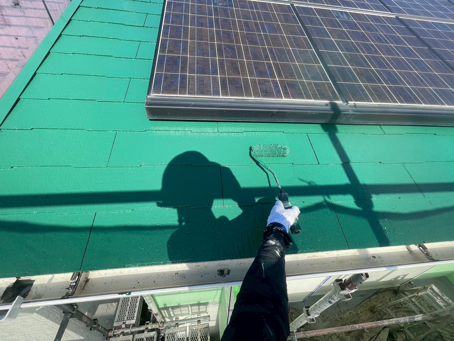 屋根・ソーラーパネル廻り、上塗り仕上げ:ラジカル塗料ローラー塗り施工です。