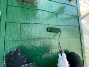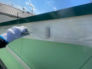 外壁・付帯部・切妻破風板、上塗り仕上げ:ラジカル塗料ローラー塗り施工です。