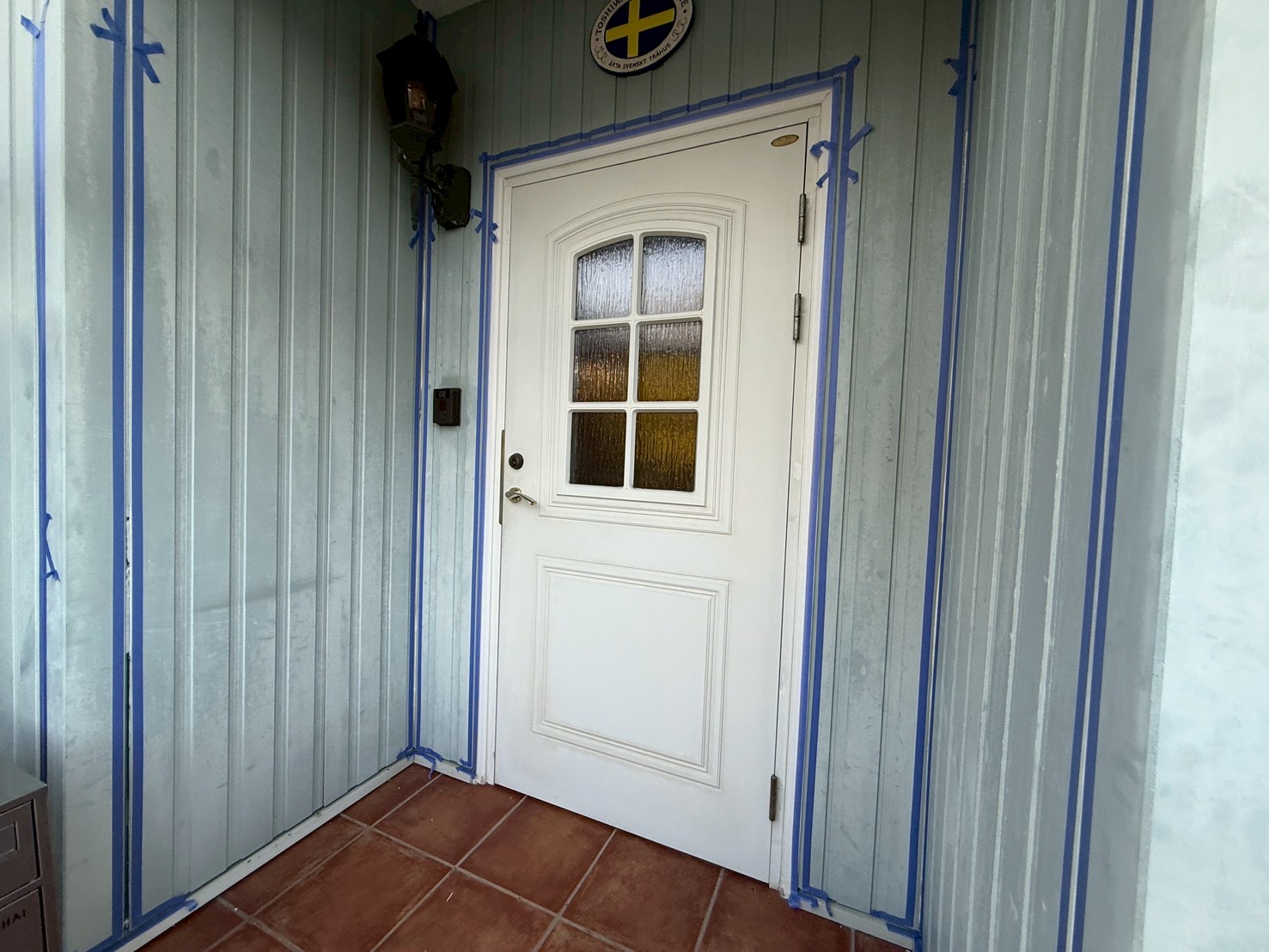 外壁・玄関廻り・旧コーキング材撤去作業:テープ養生施工です。