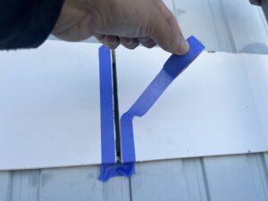 外壁・専用テープ養生と旧コーキング材撤去作業:テープ貼り作業です。