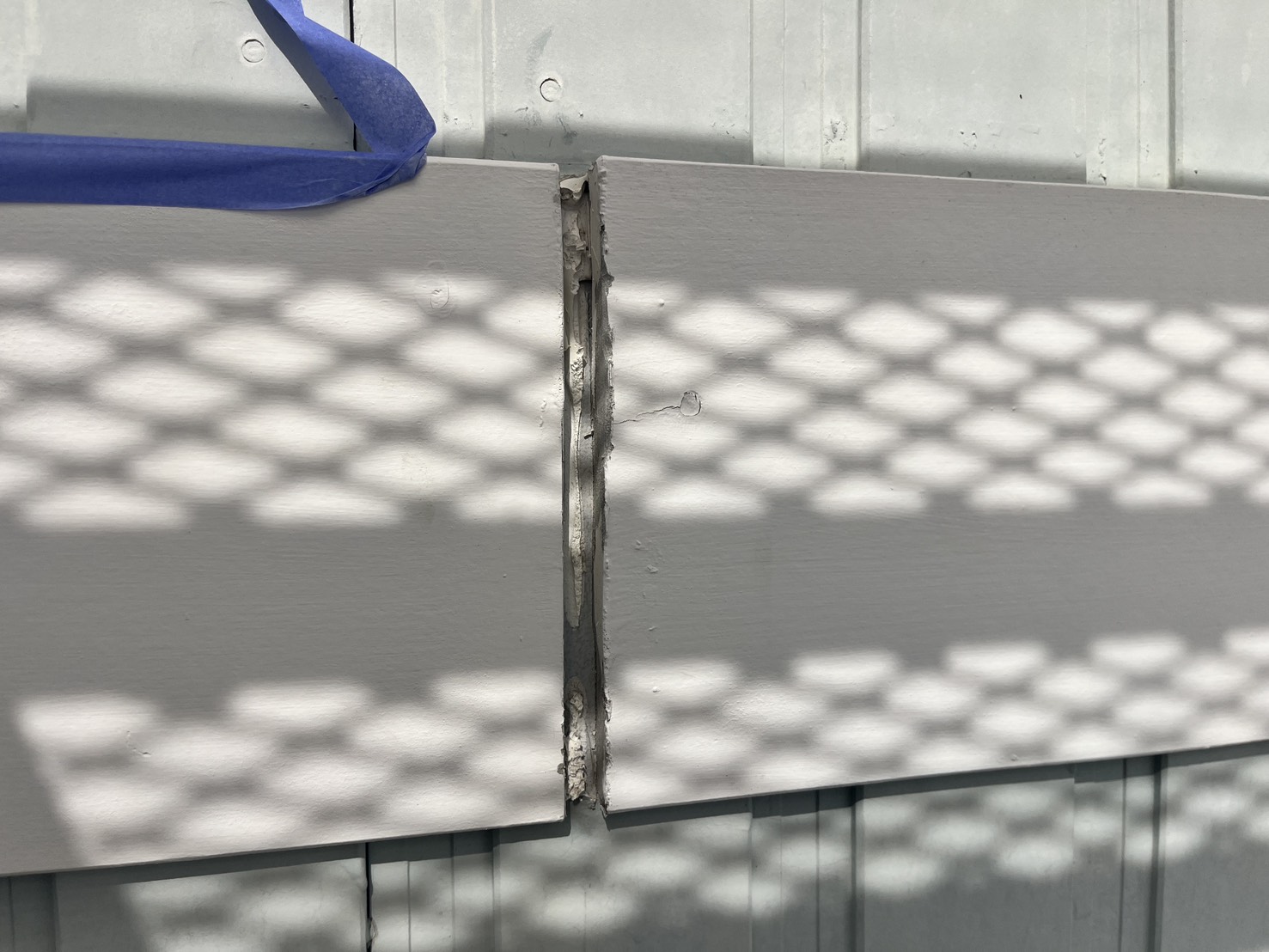 本日の作業は、外壁・専用テープ養生と旧コーキング材撤去作業です。