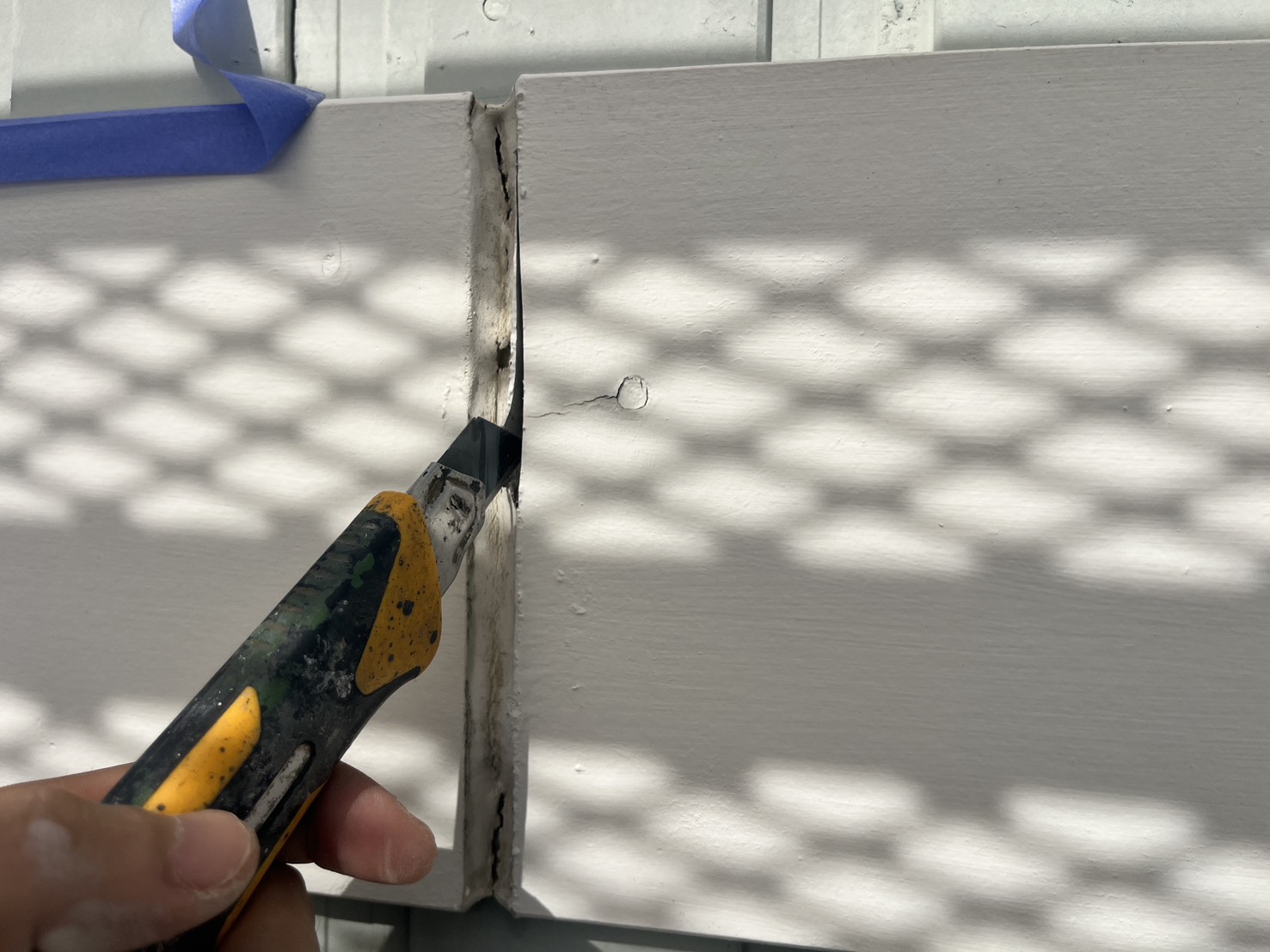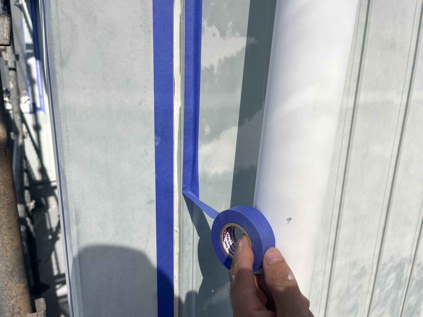 外壁・専用テープ養生と旧コーキング材撤去作業:テープ貼り作業です。