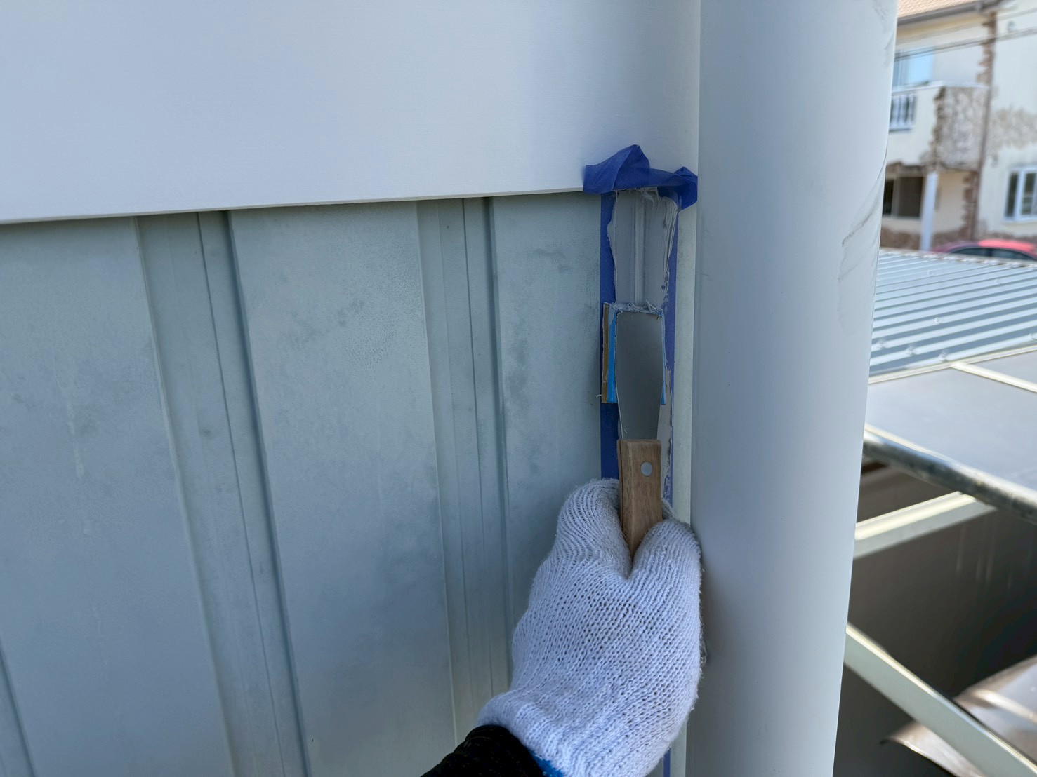 外壁・コーキング打ち替え施工:養生テープ撤去、入角部・仕上がりです。