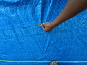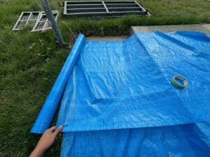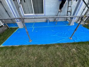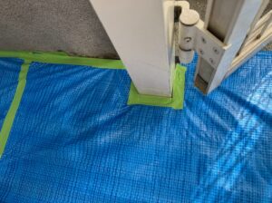 外壁・南面側ベランダ下部土間・汚さないように隅々まで、養生シートを貼ります。