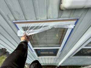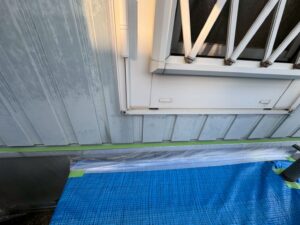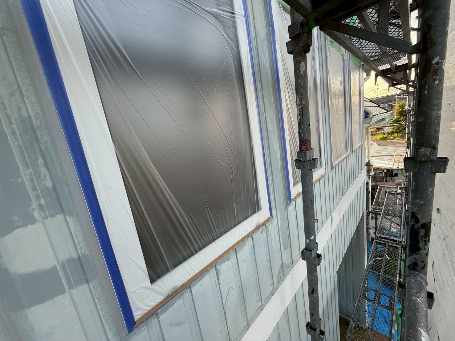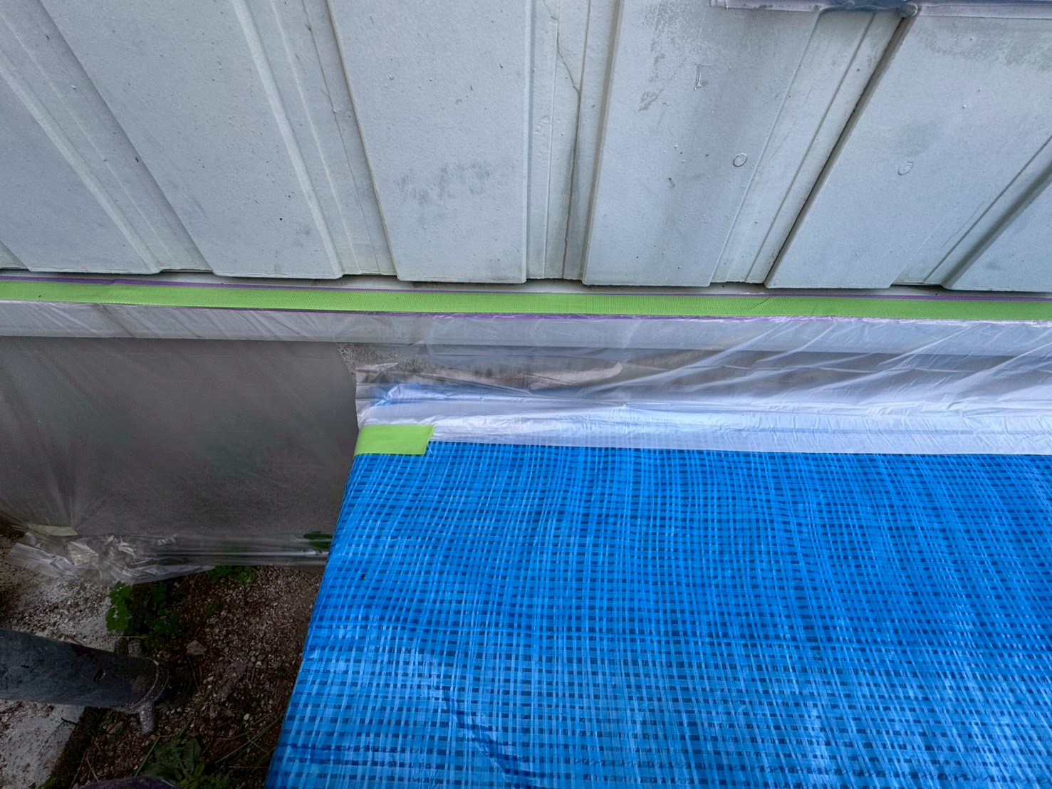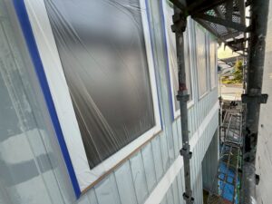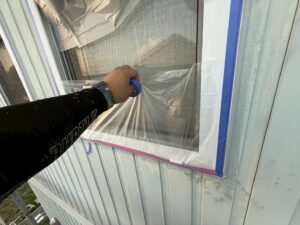外壁・窓廻り・養生施工:塗料の滲みが無いように貼り上げます。