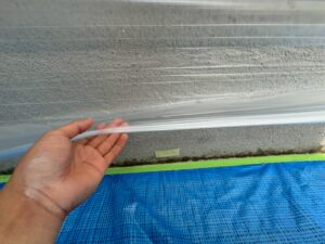外壁・基礎部廻り・養生施工:外れないように、きれいに貼ります。
