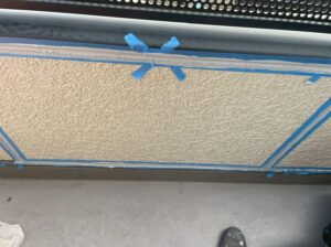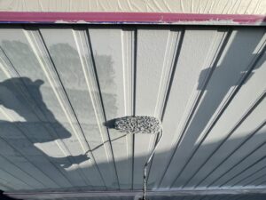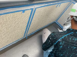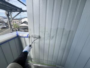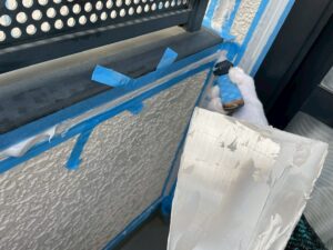 外壁・下地処理(下塗り)1Fベランダ下壁:KFスーパーウレアコート・ローラー塗り施工です。