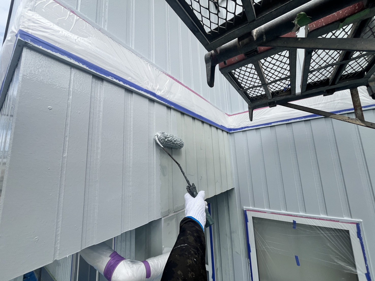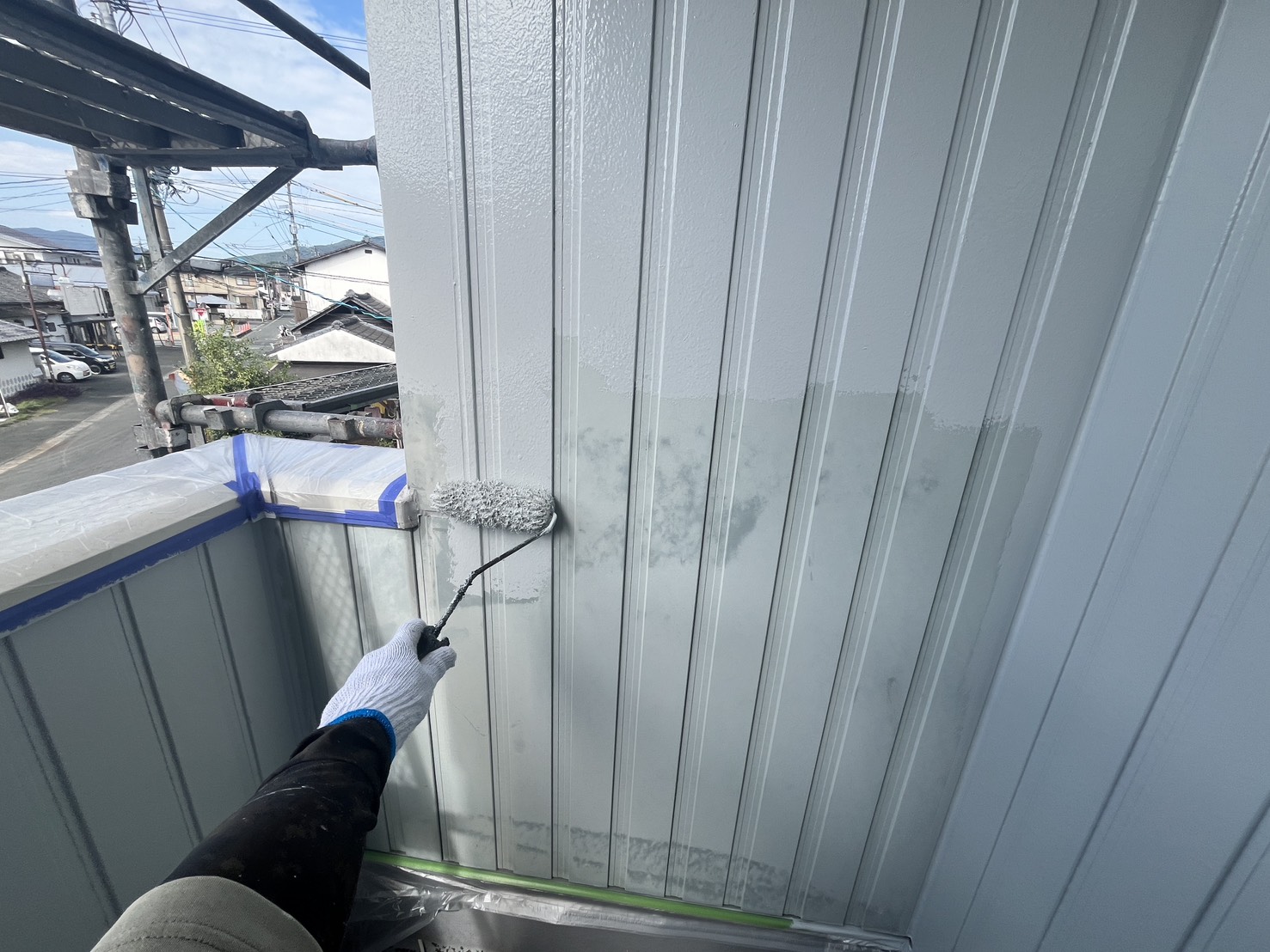 本日の作業は、外壁・養生と下地処理・付帯部の施工です。