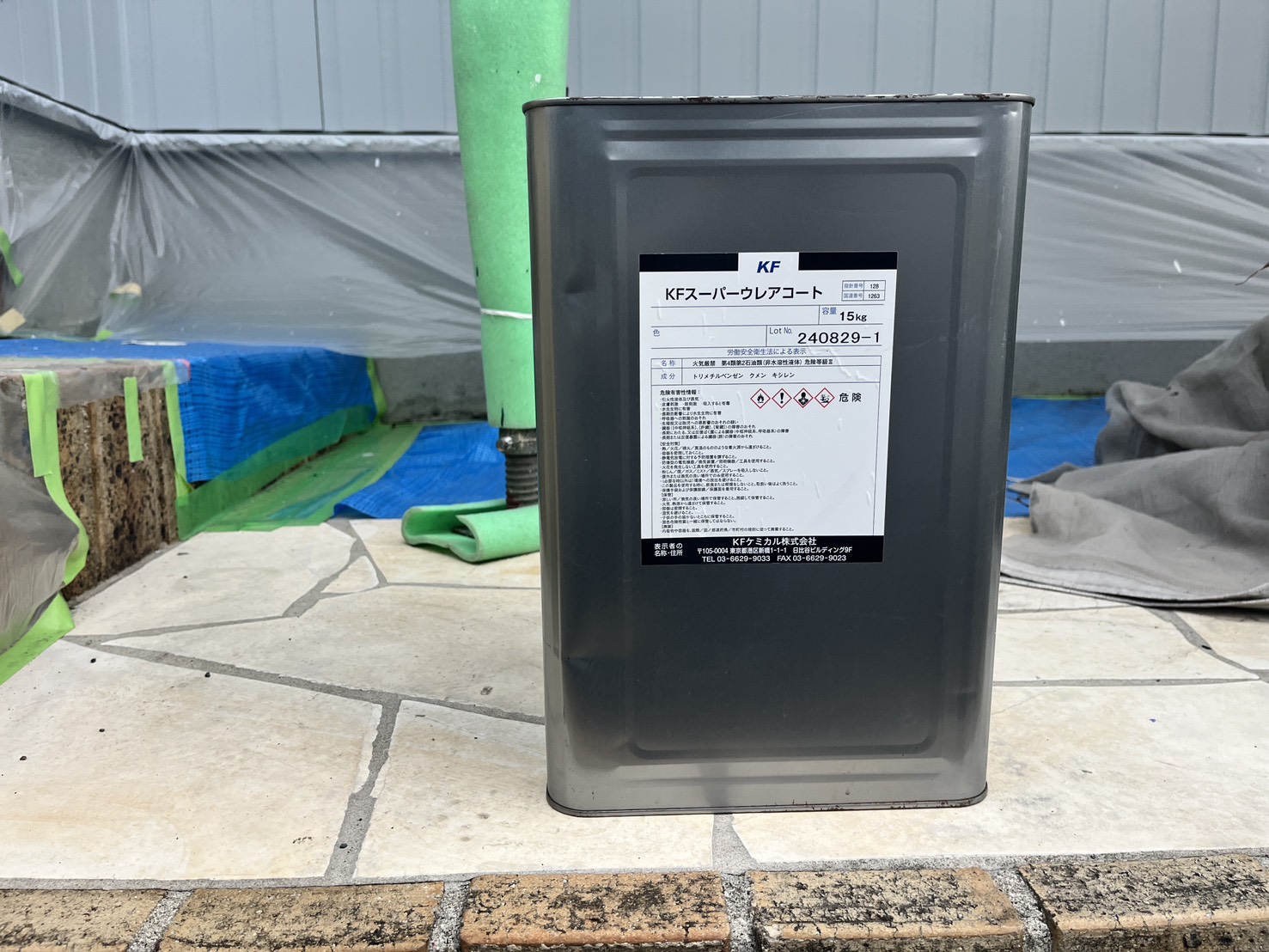 本日の作業は、外壁・中塗り・上塗り仕上げ:KFスーパーウレアコート施工です。