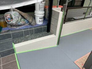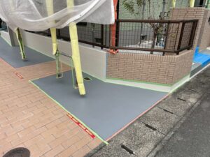 外部・ブロック塀・プレミアム無機(指定色)の上塗り仕上げ施工:スロープ廻りの仕上がりです。