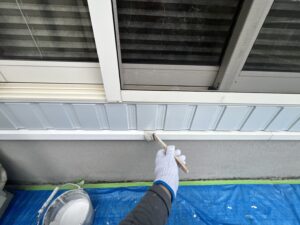 外壁・付帯部(破風板・雨樋・軒天・縦樋・雨切り・帯・小庇)上塗り仕上げ・きれいに塗り込みます。