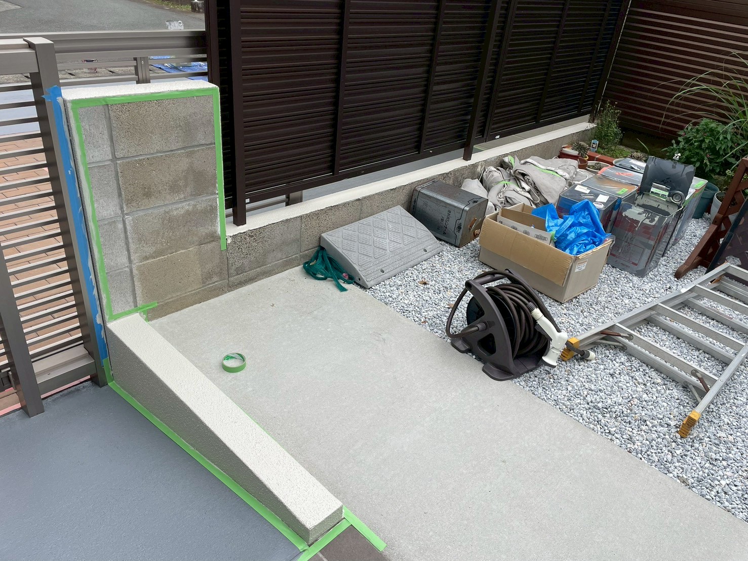 外部・ブロック塀・プレミアム無機(指定色)の上塗り仕上げ施工:スロープ廻りの仕上がりです。