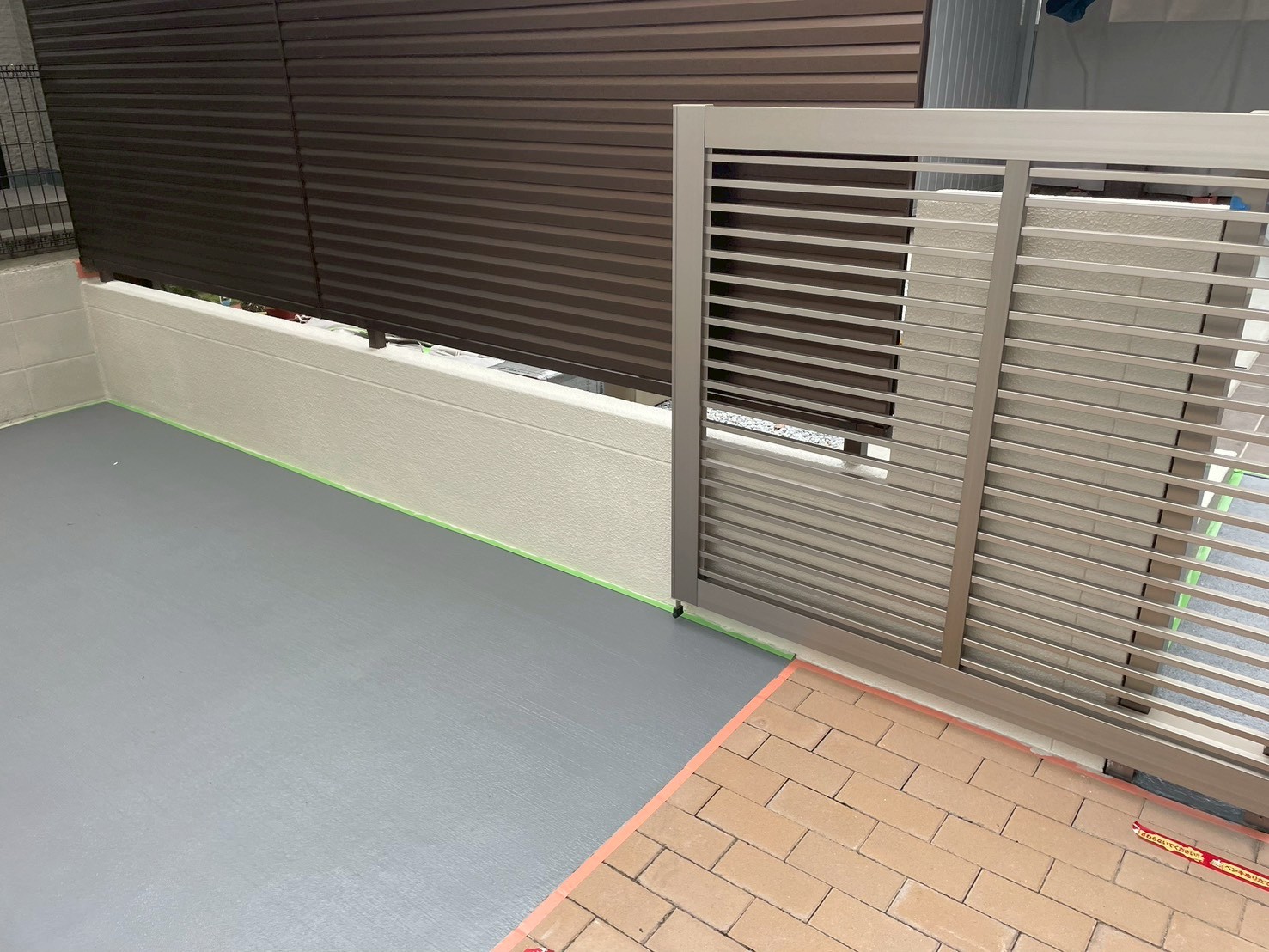外部・ブロック塀・プレミアム無機(指定色)の上塗り仕上げ施工:駐車場内部廻りの仕上がりです。