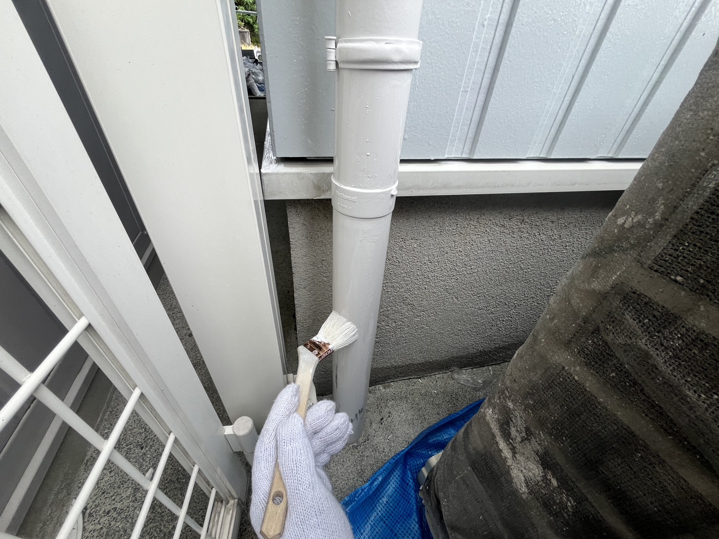 外壁・付帯部(破風板・雨樋・軒天・縦樋・雨切り・帯・小庇)上塗り仕上げ・きれいに塗り込みます。