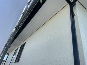 外壁・付帯部(破風板・雨樋・軒天・縦樋・雨切り・帯・小庇・外柵)各箇所の上塗り仕上げ施工です。