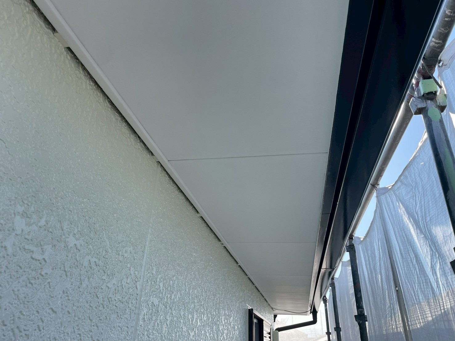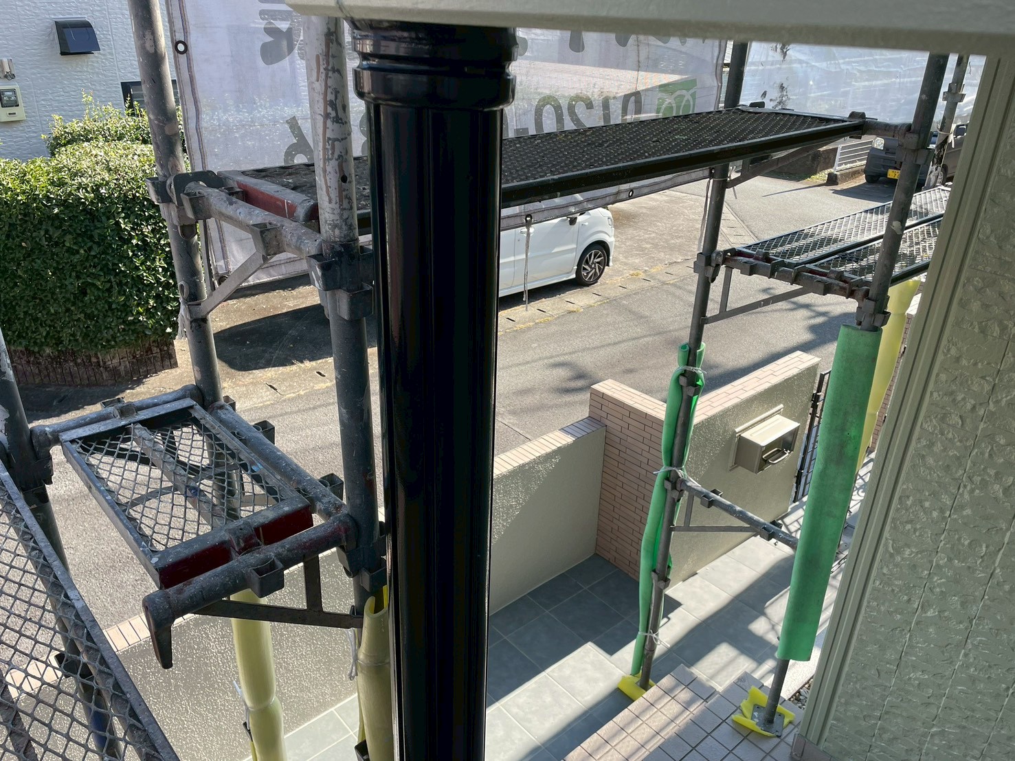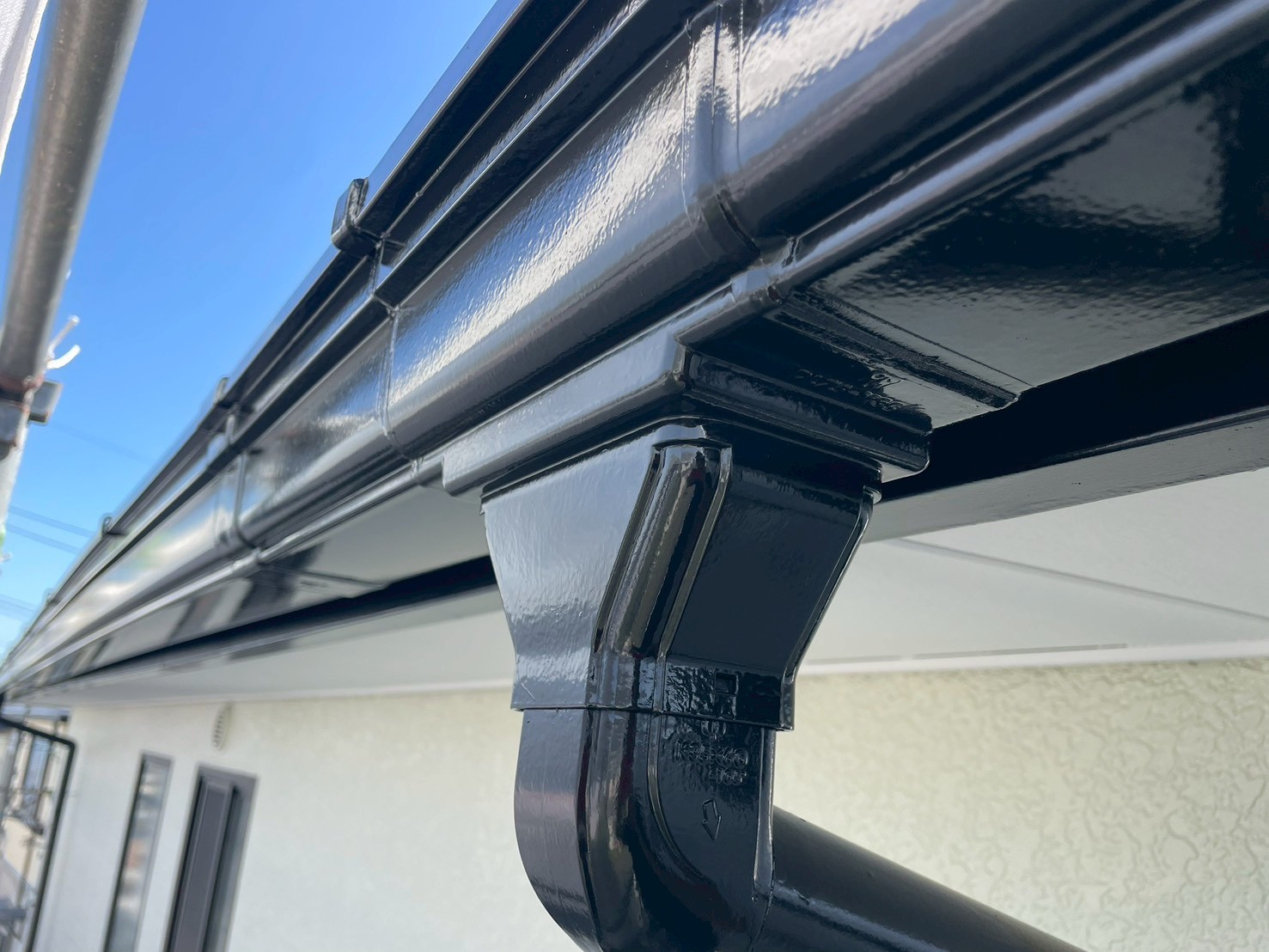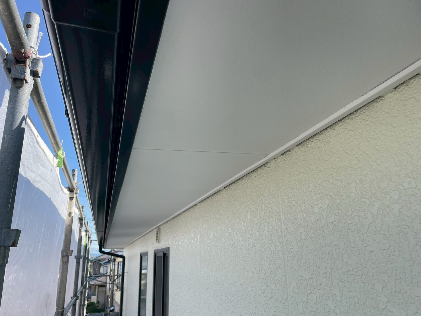 外壁・付帯部(破風板・雨樋・軒天・縦樋・雨切り・帯・小庇・外柵)各箇所の上塗り仕上げ施工です。