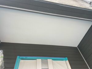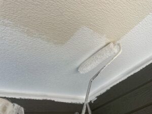 外壁・玄関軒天・上塗り仕上げ:ケンエースG-Ⅱ(防カビ剤入り)のローラー塗り施工です。