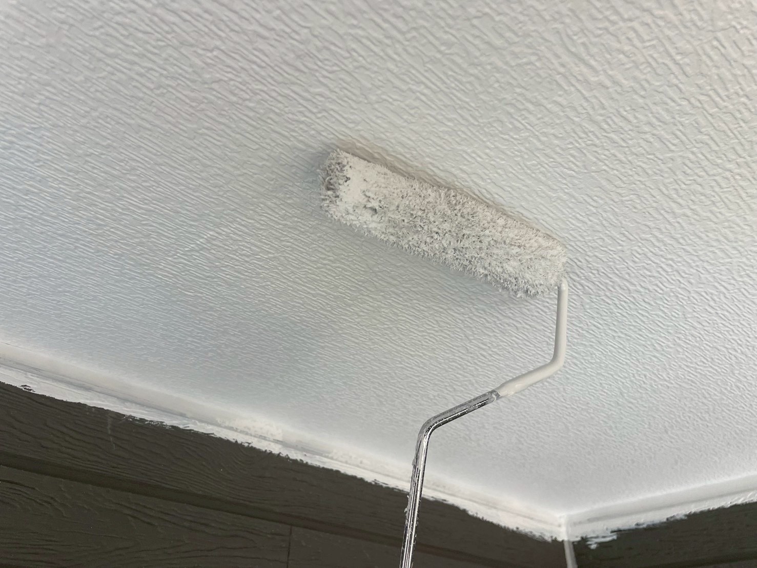 外壁・玄関軒天・上塗り仕上げ:ケンエースG-Ⅱ(防カビ剤入り)のローラー塗り施工です。