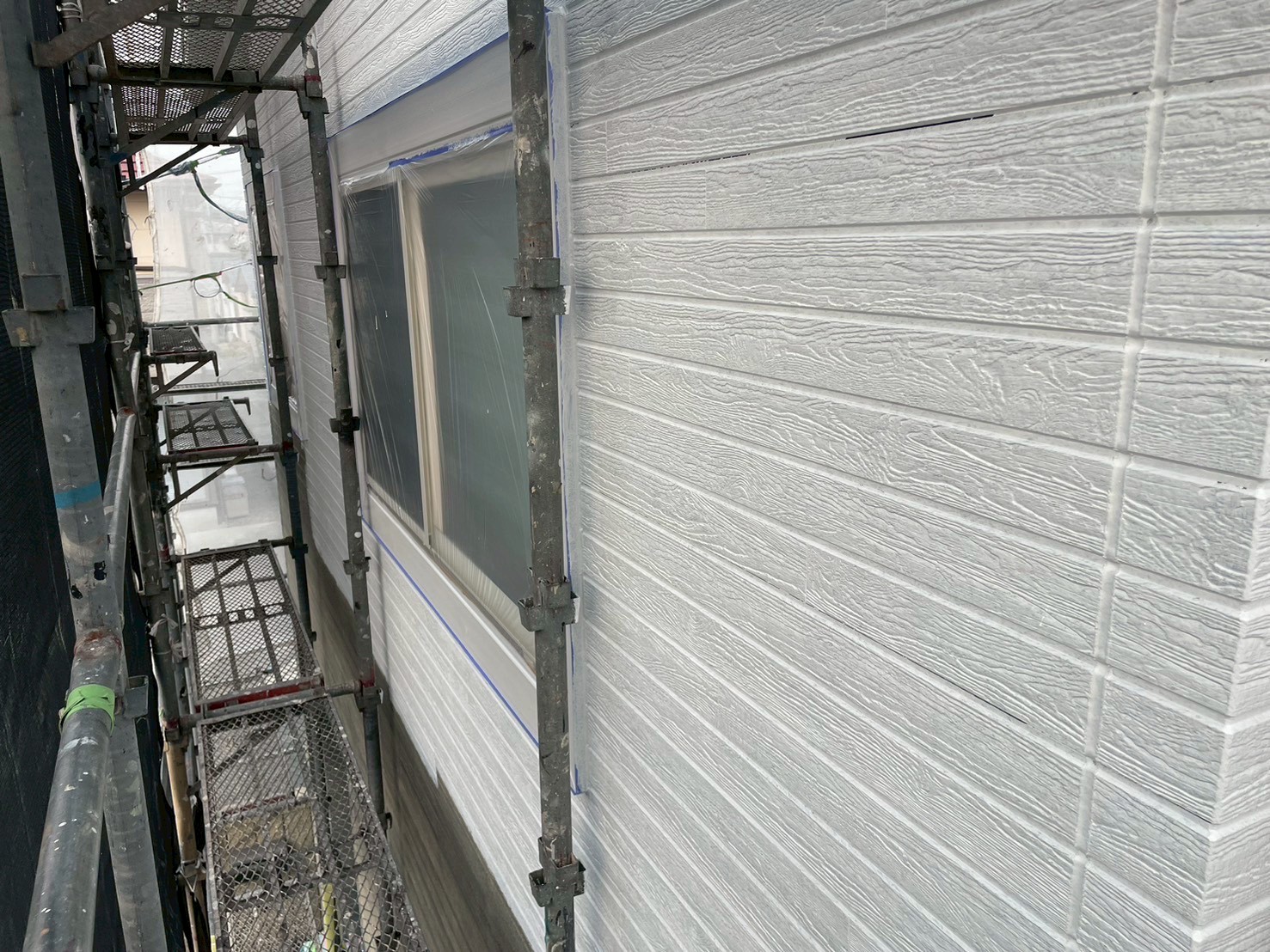 本日の作業は、外壁・下地処理(下塗り)と特殊セラミック ガイナ中塗り施工です。
