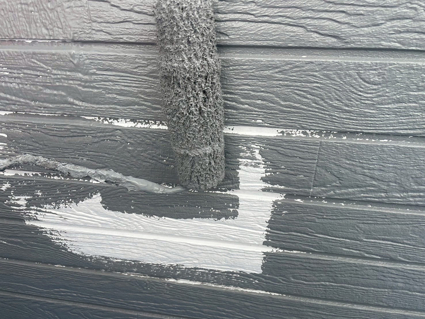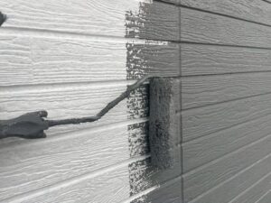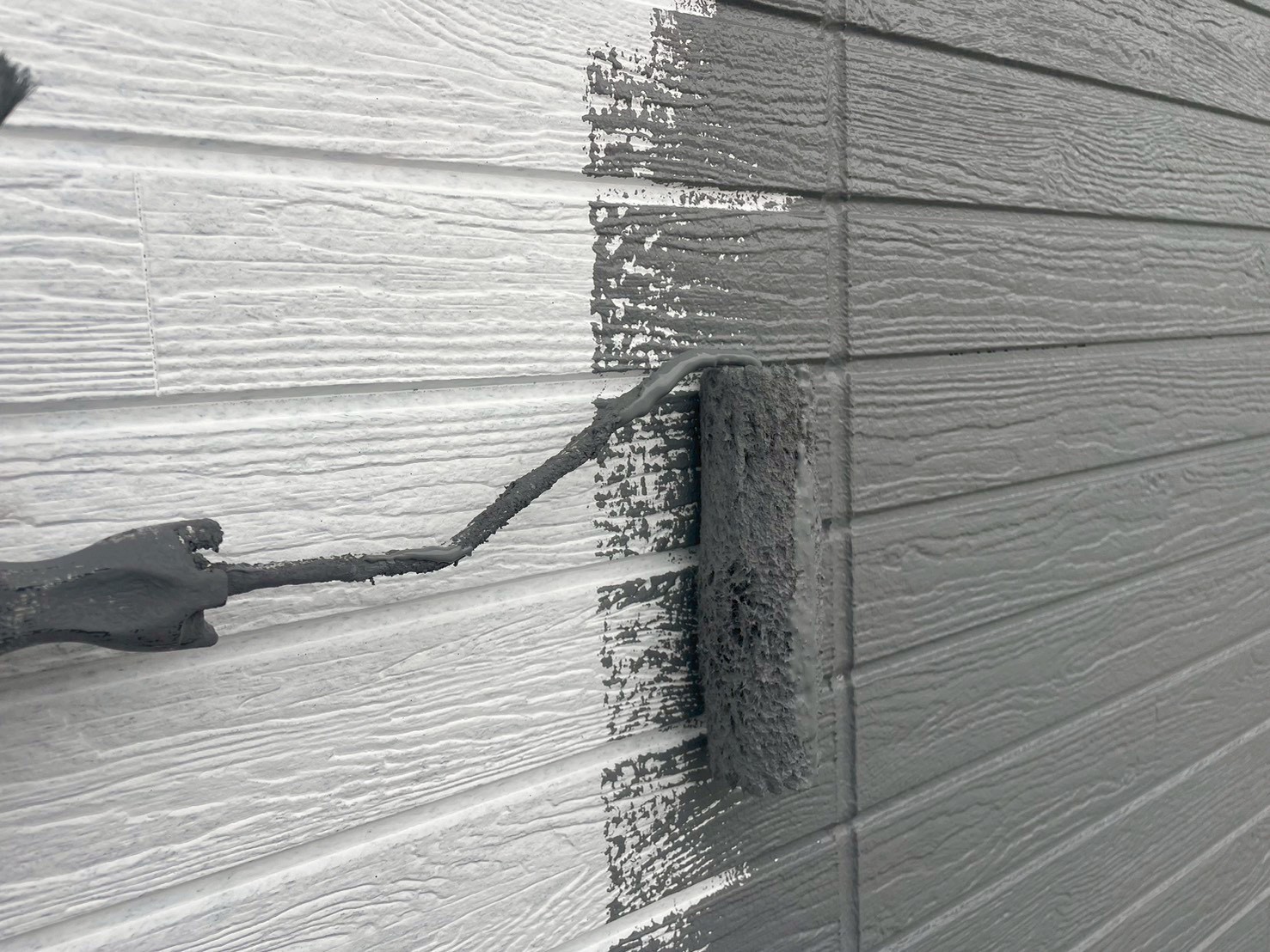 外壁・壁面2F部・中塗り:特殊セラミック ガイナ 断熱遮熱塗料、ローラー塗り施工です。