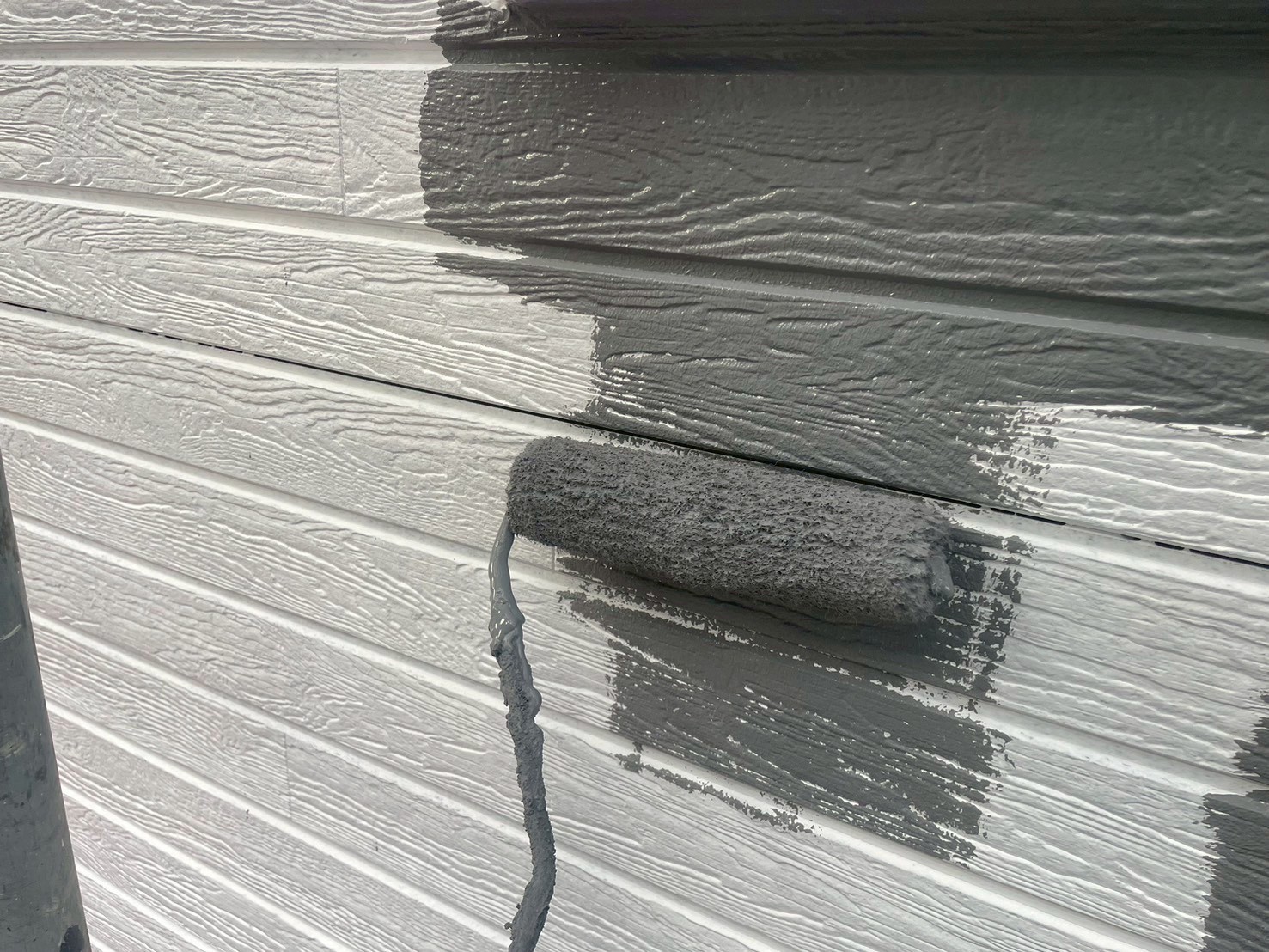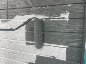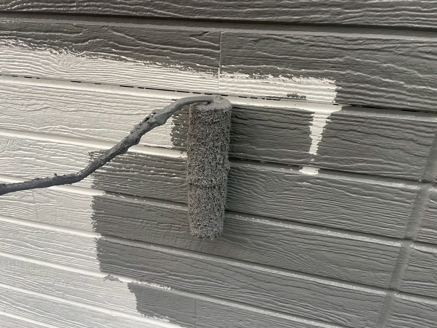 外壁・中塗り:特殊セラミック ガイナ 断熱遮熱塗料のローラー塗り施工・西面側の中塗り仕上げです。
