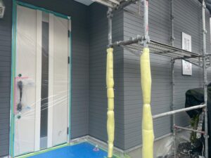 外壁・中塗り:特殊セラミック ガイナ 断熱遮熱塗料のローラー塗り施工・玄関廻りの中塗り仕上げです。