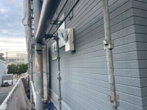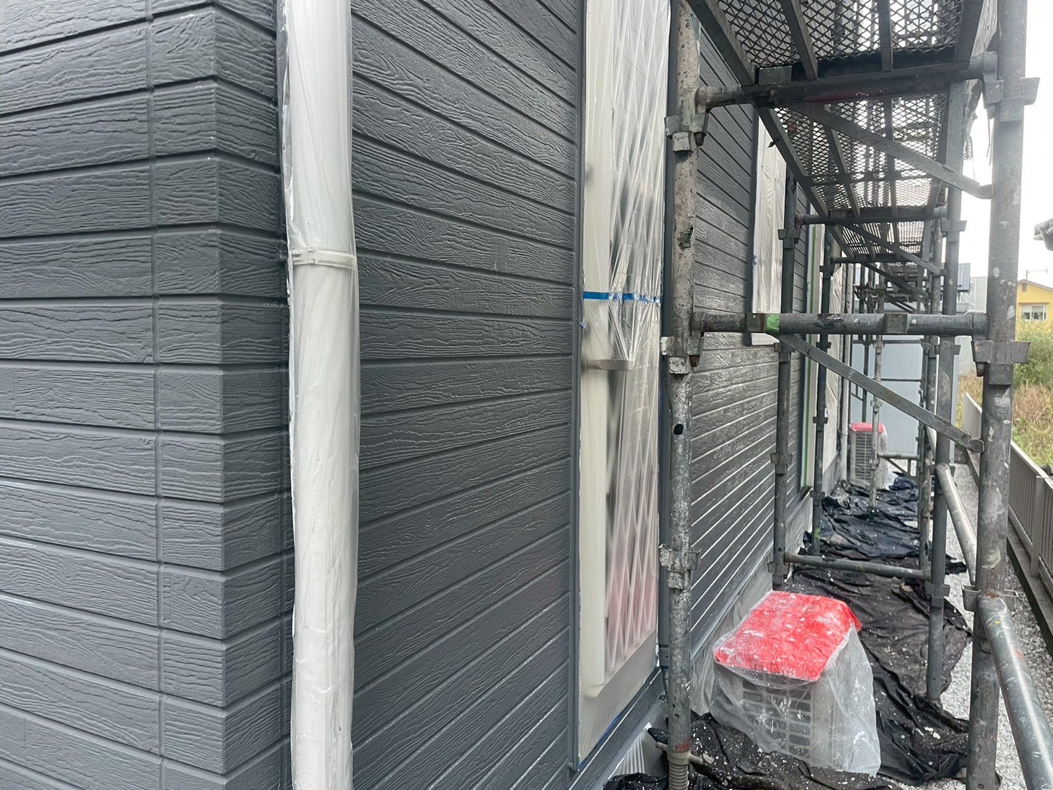 外壁・中塗り:特殊セラミック ガイナ 断熱遮熱塗料のローラー塗り施工・東面側の中塗り仕上げです。 ※しっかり乾燥させます。