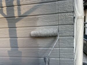 外壁・上塗り仕上げ・1F駐車場側:特殊セラミック ガイナ 断熱遮熱塗料のローラー塗り施工です。