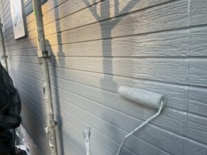 外壁・上塗り仕上げ・西面側:特殊セラミック ガイナ 断熱遮熱塗料のローラー塗り施工です。