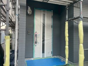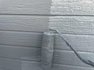 外壁・上塗り仕上げ・玄関廻り:特殊セラミック ガイナ 断熱遮熱塗料のローラー塗り施工です。