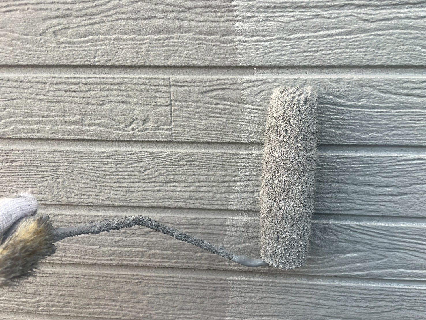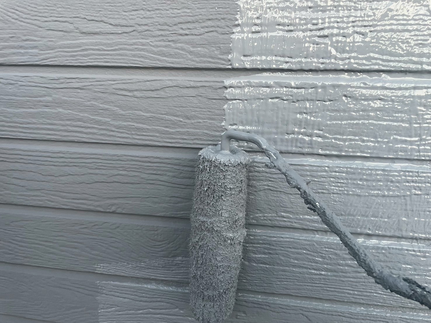 外壁・上塗り仕上げ・1F駐車場側:特殊セラミック ガイナ 断熱遮熱塗料のローラー塗り施工です。