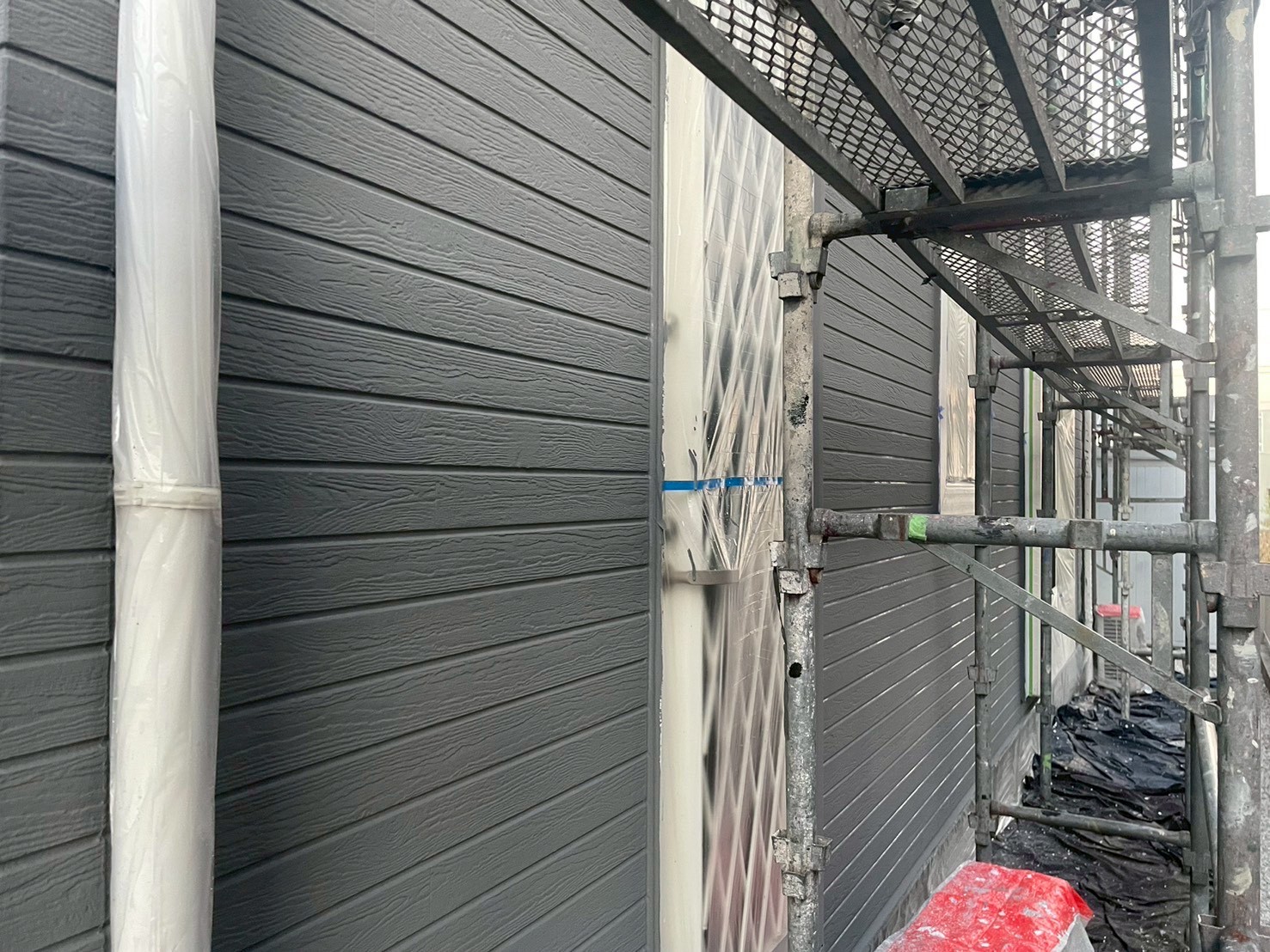 本日の作業は、外壁・上塗り:特殊セラミック ガイナ 断熱遮熱塗料・確認仕上げの施工です。