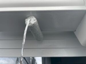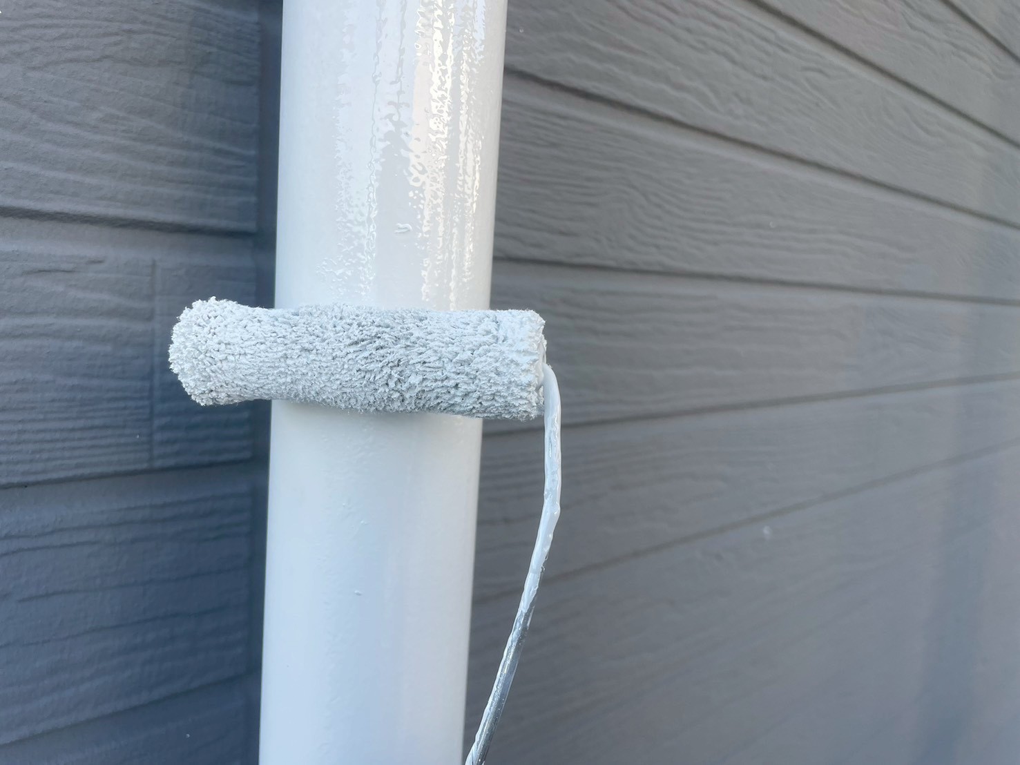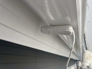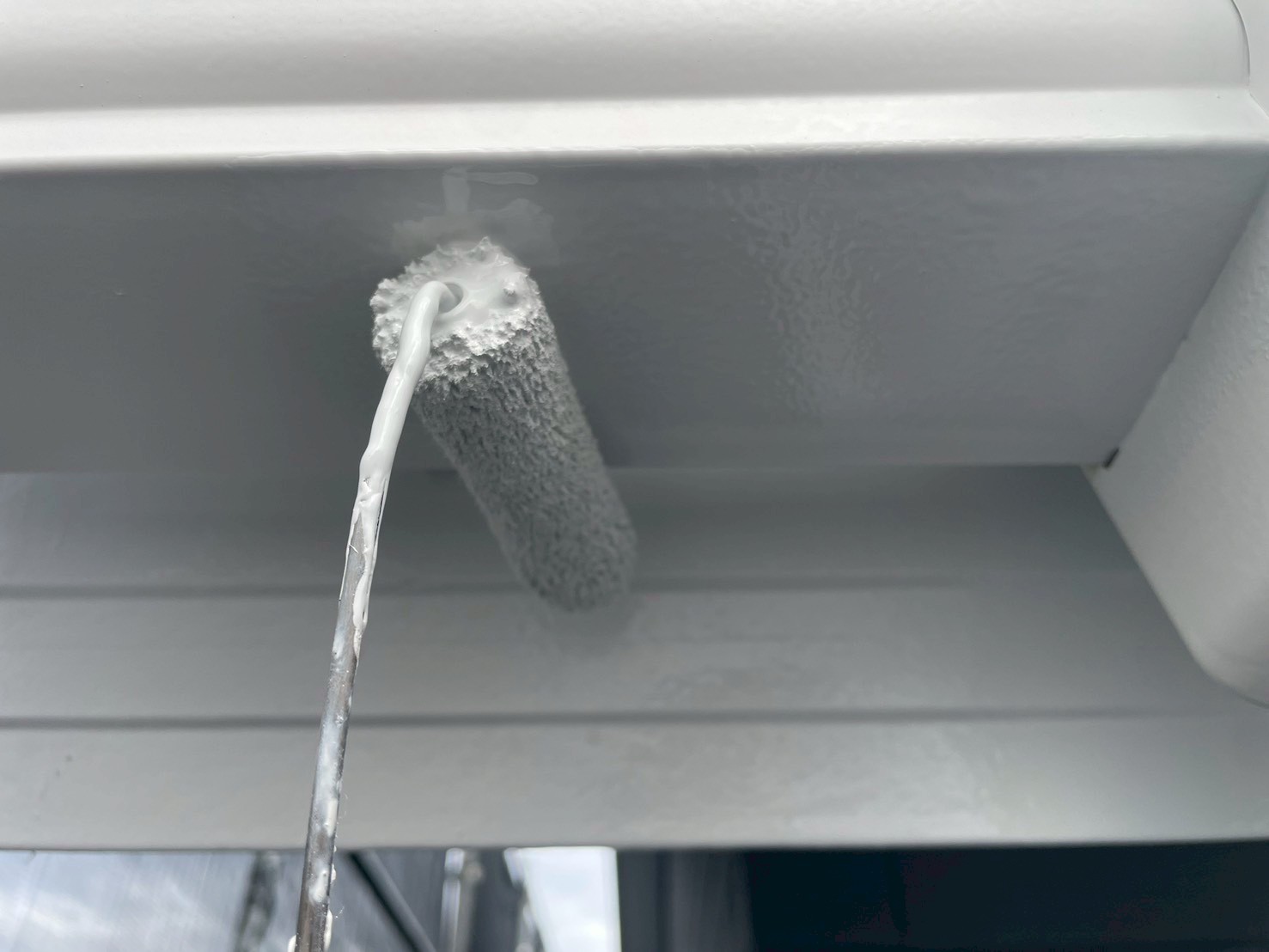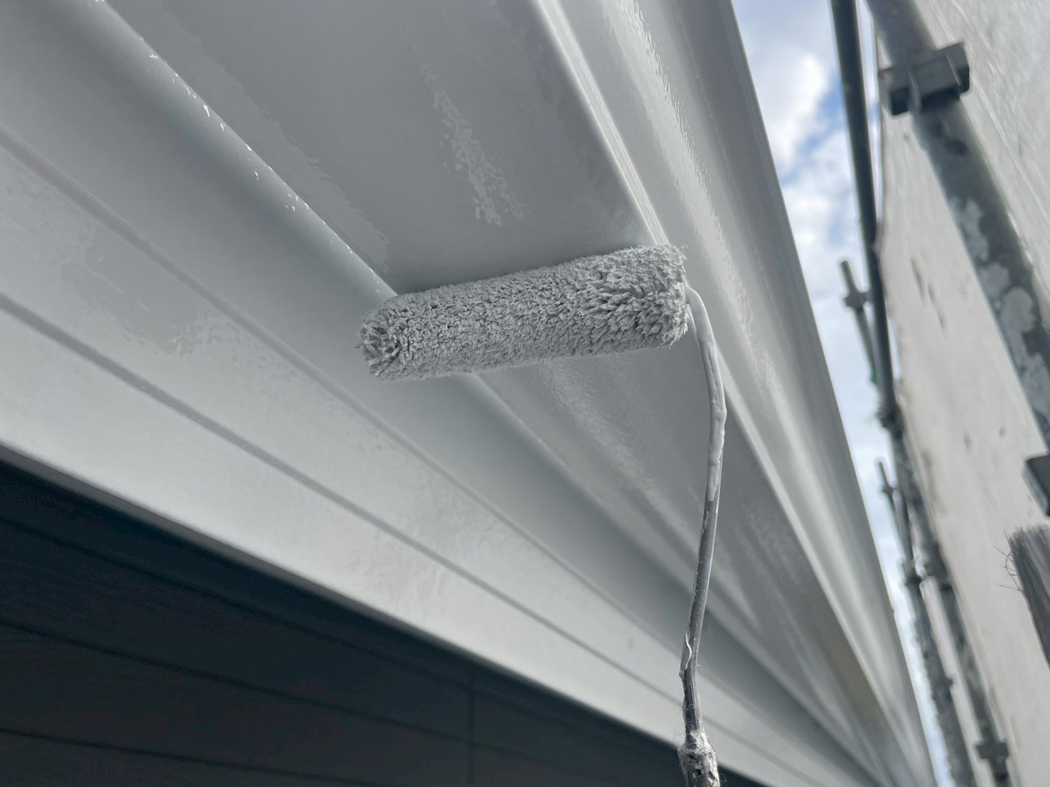 外壁・養生撤去後、中塗り:KF無機4フッ化フッ素樹脂ホワイト色の施工です。 (雨樋・破風板・縦樋部=中塗り作業です)