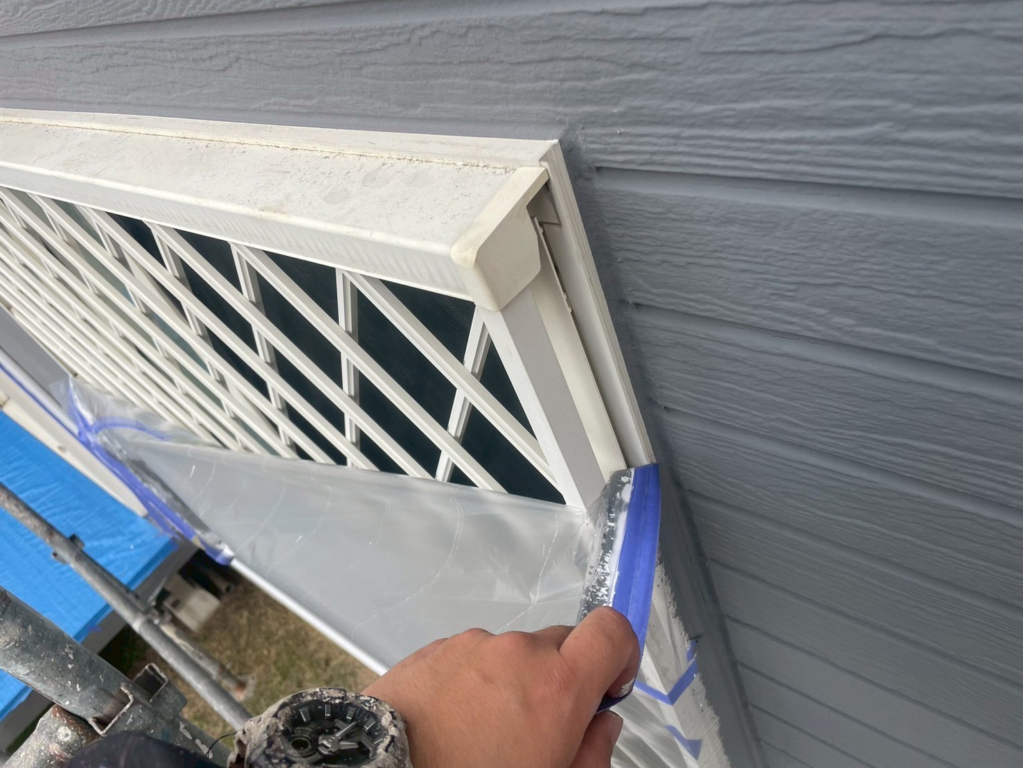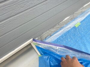 外壁・上塗り仕上げ・特殊セラミック ガイナ 断熱遮熱塗料のローラー塗り施工確認後、窓廻り・養生の撤去作業です。