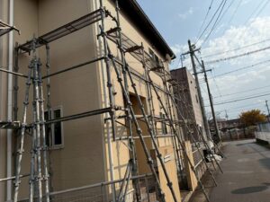 外壁・屋根・架設足場組み上げと飛散防止ネット取り付けの施工:使用場所に配置します。