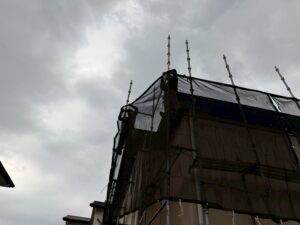 外壁・屋根・架設足場組み上げと飛散防止ネット取り付けの施工:飛散防止ネットの取り付けです。