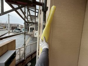 前回までの作業は、外壁・上塗り仕上げ・特殊セラミック ガイナ 断熱遮熱塗料のローラー塗り施工確認後、各養生の撤去作業です。
