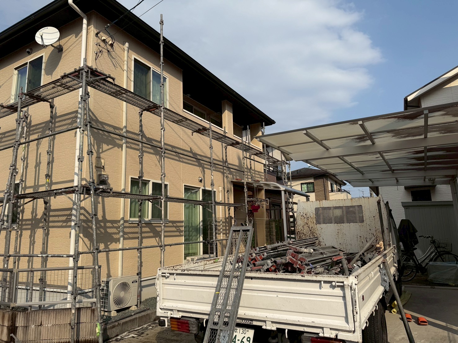 外壁・屋根・架設足場組み上げと飛散防止ネット取り付けの施工:トラックからの搬入です。