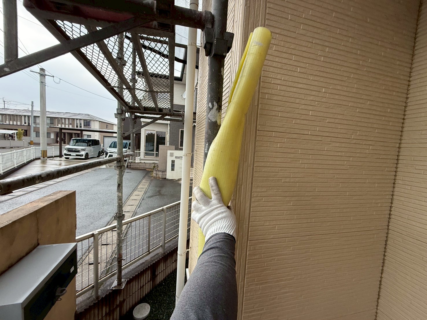 前回までの作業は、外壁・上塗り仕上げ・特殊セラミック ガイナ 断熱遮熱塗料のローラー塗り施工確認後、各養生の撤去作業です。