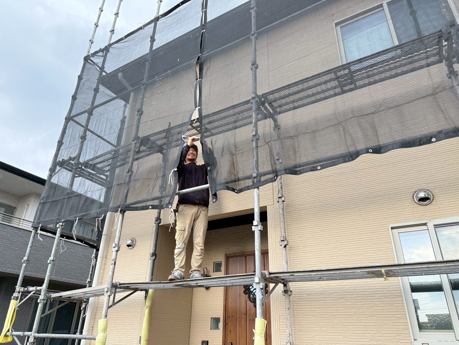 外壁・屋根・架設足場組み上げと飛散防止ネット取り付けの施工:飛散防止ネットの取り付けです。